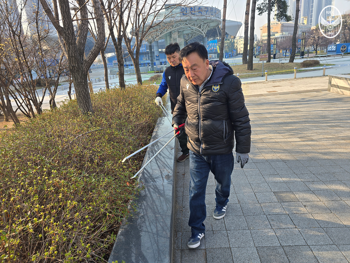 인천유나이티드 조건도 대표이사가 새봄을 맞아 이른 아침부터 경기장 주변 환경 정화 활동에 나서며 지역 밀착형 구단 운영의 모범을 보이고 있다.