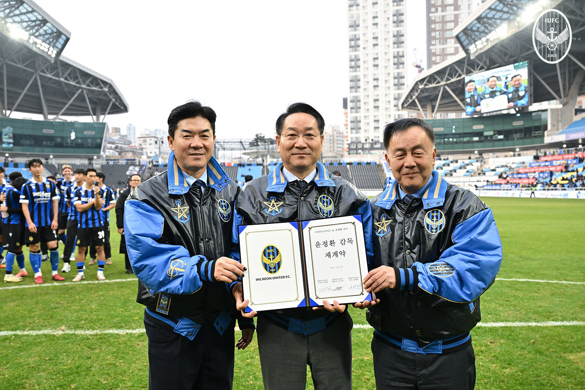 경기 종료 후 시상식 준비가 이어지는 동안 S석 앞에서는 윤정환 감독의 재계약 발표회가 열렸다. 유정복 인천광역시장과 조건도 대표이사는 윤정환 감독에게 다음 시즌 동행을 제안했고, 윤정환 감독이 현장에서 준비된 계약서에 서명하며 재계약이 공식 확정됐다. 생존왕을 넘어 K리그1의 강팀으로 다시 도약하겠다는 그의 선언은, 지난해 강등으로 상처받은 인천 팬들에게 무엇보다 값진 선물이 됐다. 팬들은 지난 2년간 마음속에 묵혀두었던 ‘가자, 아시아로!’ 응원가를 힘차게 불렀다. 승격과 재계약으로 보답한 감독과 구단에 힘을 실어주는 동시에, 내년 K리그1에서 마주할 11개 팀을 향한 파랑검정의 당당한 출사표였다.