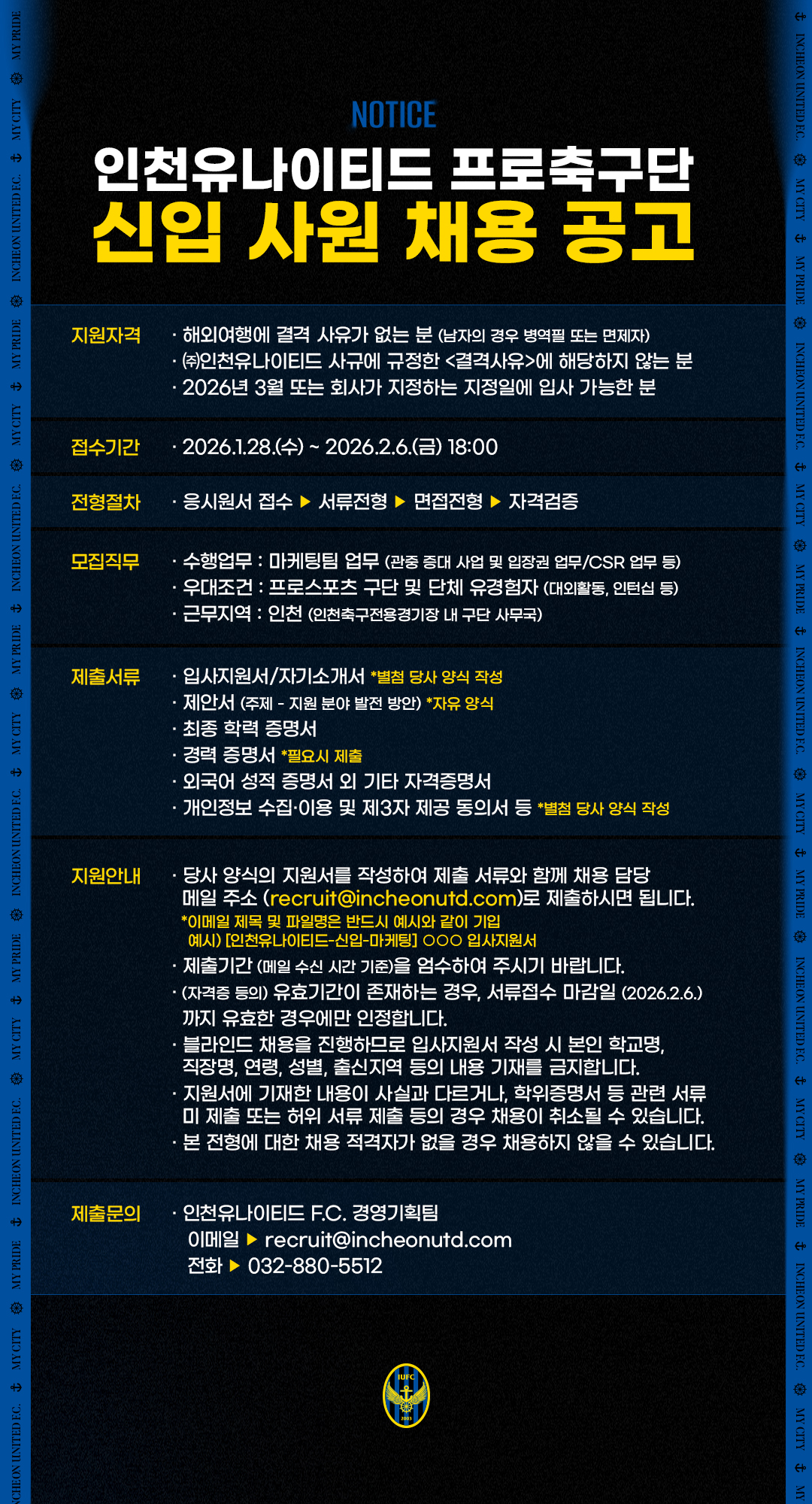 접수방법 : ㈜인천유나이티드 이메일(recruit@incheonutd.com) 접수 ※ 시한 미준수 시 불인정