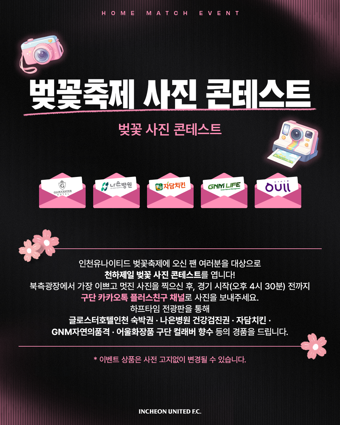 인천유나이티드 벚꽃축제에 오신 팬 여러분을 대상으로 천하제일 벚꽃 사진 콘테스트를 엽니다!
