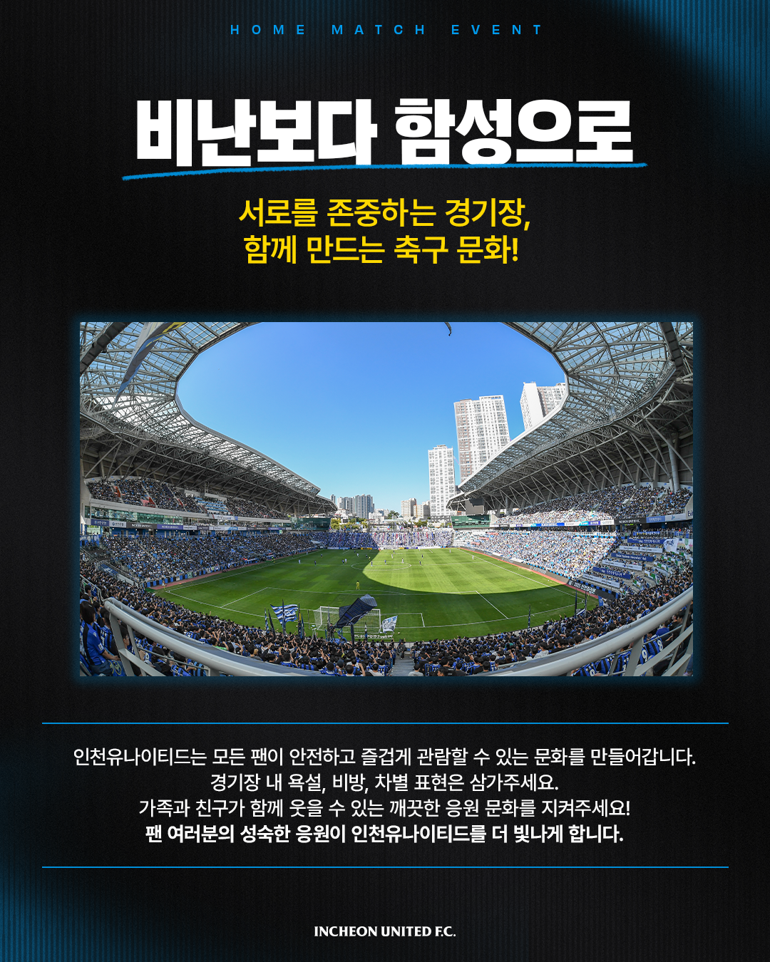 팬 여러분의 성숙한 응원이 인천유나이티드를 더 빛나게 합니다. 감사합니다.