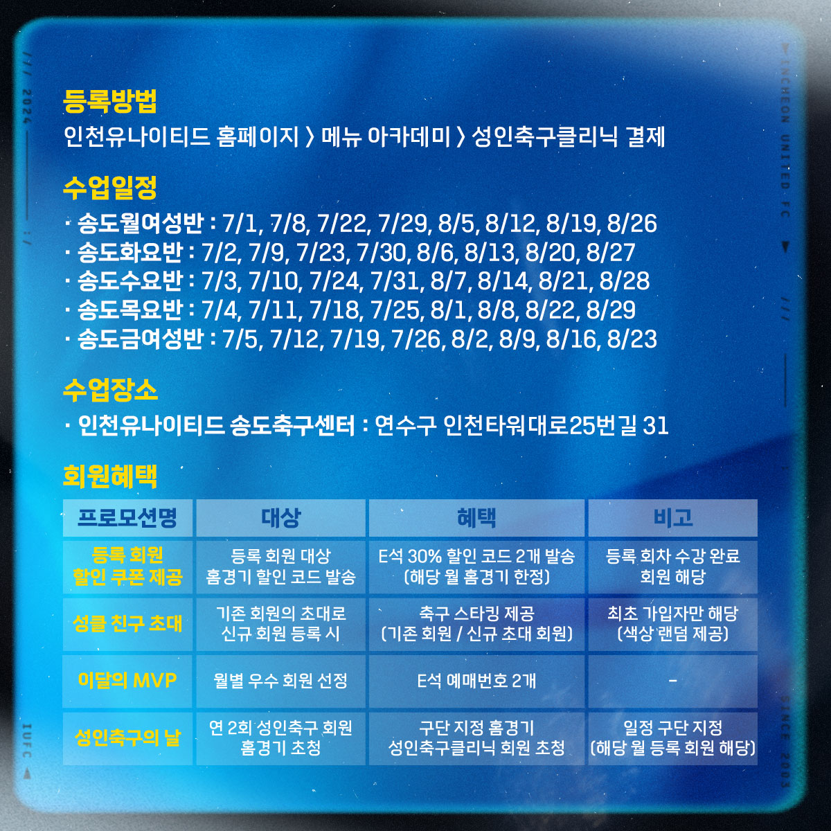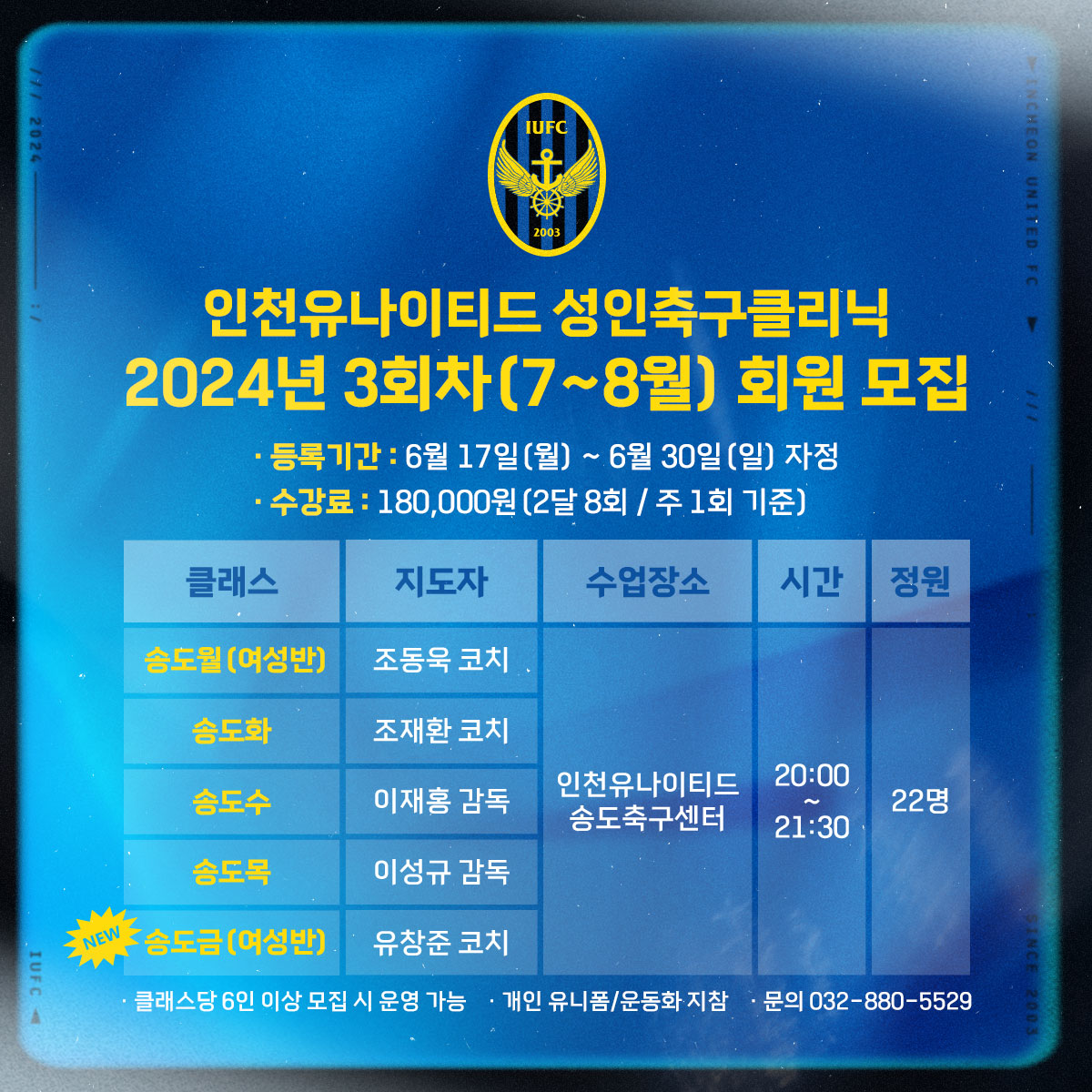 ※송도금여성반(유창준 U-12 코치 지도) 수업이 신규 개설되었습니다. 많은 관심 부탁드립니다.2024년도 성인축구클리닉 3회차(7월~8월) 회원 모집 안내