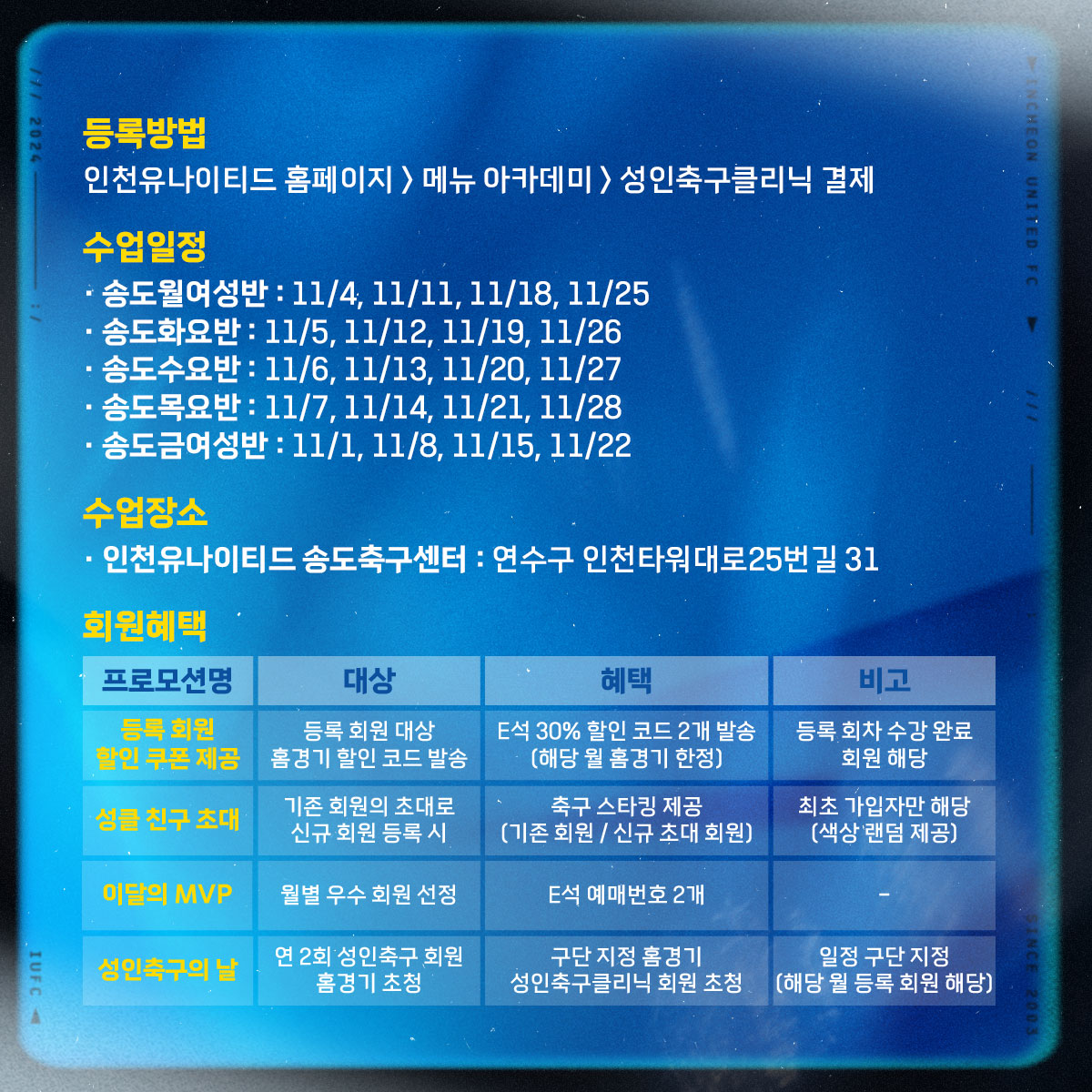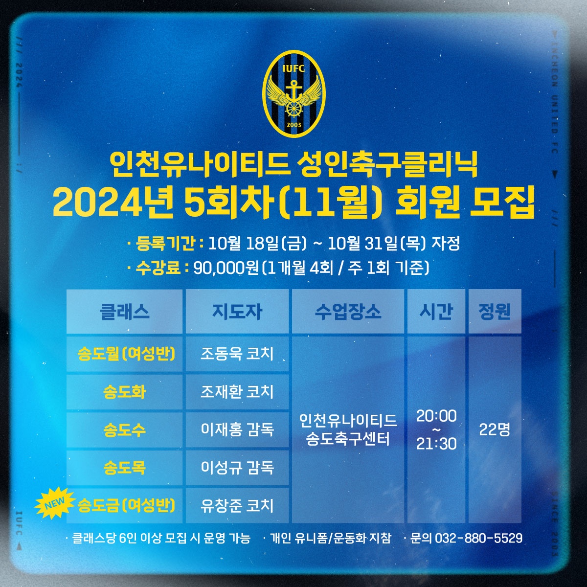 ※송도금여성반(유창준 U-12 코치 지도) 수업이 신규 개설되었습니다. 많은 관심 부탁드립니다.2024년도 성인축구클리닉 5회차(11월) 회원 모집 안내