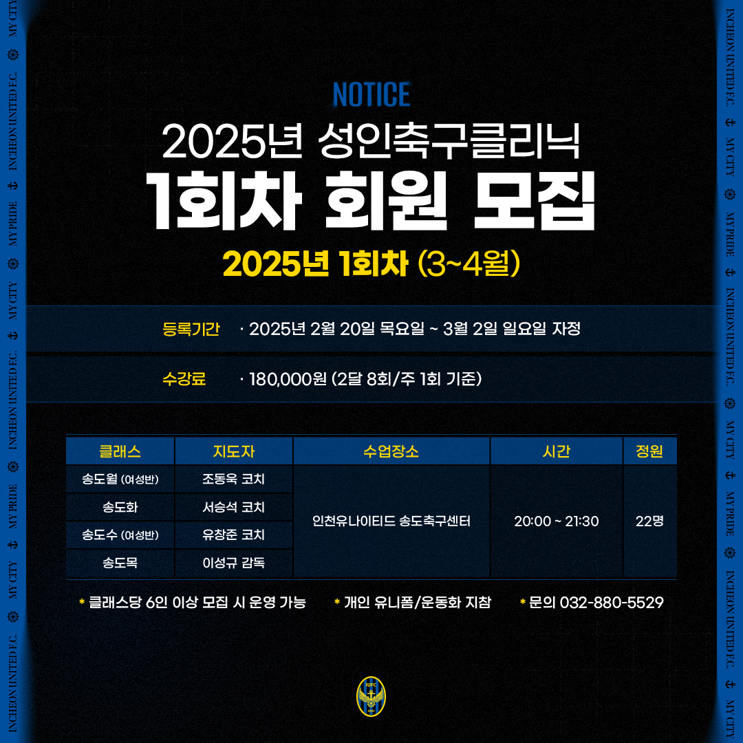 2025년도 성인축구클리닉 1회차(3~4월) 회원 모집 관련 안내드립니다.