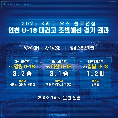 인천유나이티드 U18 인천대건고·U15 인천광성중, 예선 첫 경기 나란히 대승