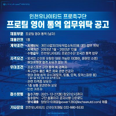 <공고> 2022년도 인천유나이티드 프로팀 영어 통역 업무위탁 공고