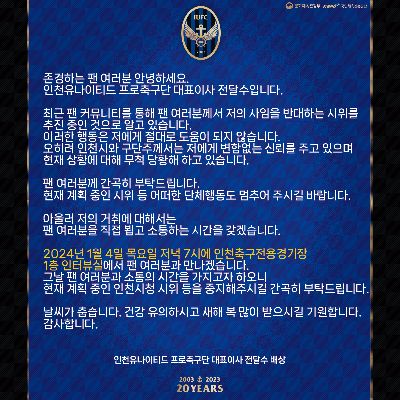 대표이사가 팬 여러분께 간곡하게 드리는 말씀