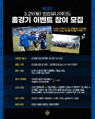 3월 29일(토) 인천유나이티드 개학맞이 홈경기 이벤트 참여 모집