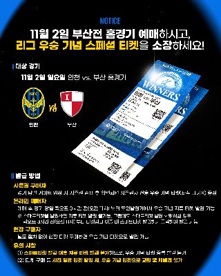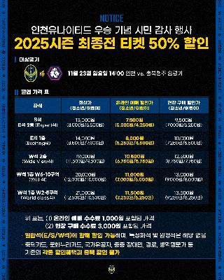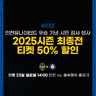2025시즌 인천유나이티드 우승 기념 시민 감사 리그 최종전 티켓 50% 할인 판매 안내