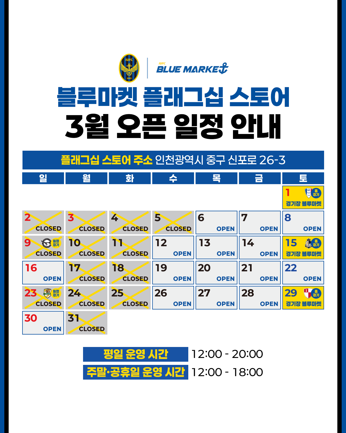 블루마켓 플래그십 스토어 3월 오픈 일정 안내(코리아컵 일정 반영)