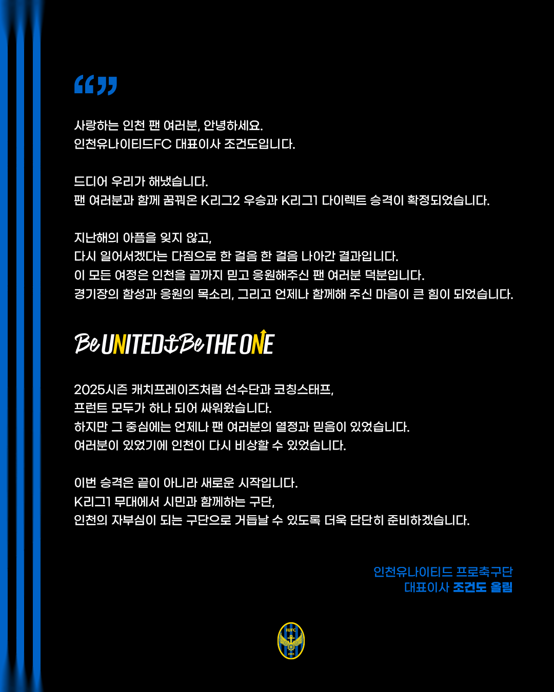 인천유나이티드, 2025시즌 캐치프레이즈 ‘BE UNITED, BE THE ONE’ 발표