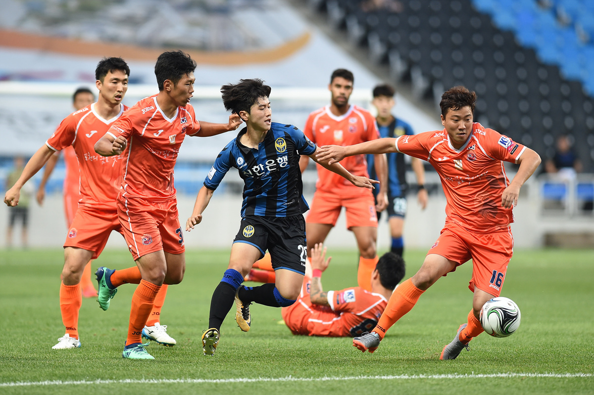 인천은 후반 15분 쿠비 대신 김동석을 투입했고, 포천은 강우열을 빼고 김경훈을 넣었다. 이어 후반 19분에는 포천 지경득이 나오고 이민규가 들어갔다. 후반 22분 인천이 위기를 넘겼다. 김상근이 인천의 볼을 잘라서 올린 볼을 김유성이 헤더로 마무리했지만 정산이 막아냈다.
