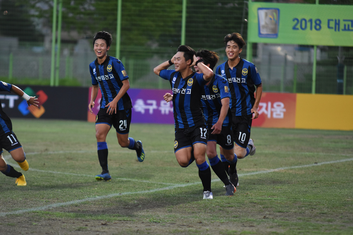 전반 초반부터 팽팽한 공방전이 이어졌다. 그러던 전반 21분 인천 대건고가 선제골을 뽑아냈다. 박형빈이 상대 골키퍼의 실수를 틈타 볼을 탈취한 다음 침착하게 골을 만들어냈다. 선제골을 뽑아낸 인천 대건고는 탄력적인 경기 운영을 통해 추가골 사냥을 위해 전진했다.