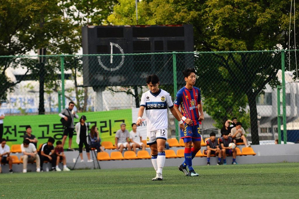 세차게 두드리던 인천 대건고가 후반 19분 마침내 동점골을 뽑아냈다. 김채웅이 측면에서 연결해준 볼을 최세윤이 침착히 마무리했다. 동점골 이후 인천 대건고 전재호 감독은 천성훈과 김채운을 차례로 교체 투입하며 공격력을 보강했다. 인천 대건고가 거센 공격을 이어나갔다.