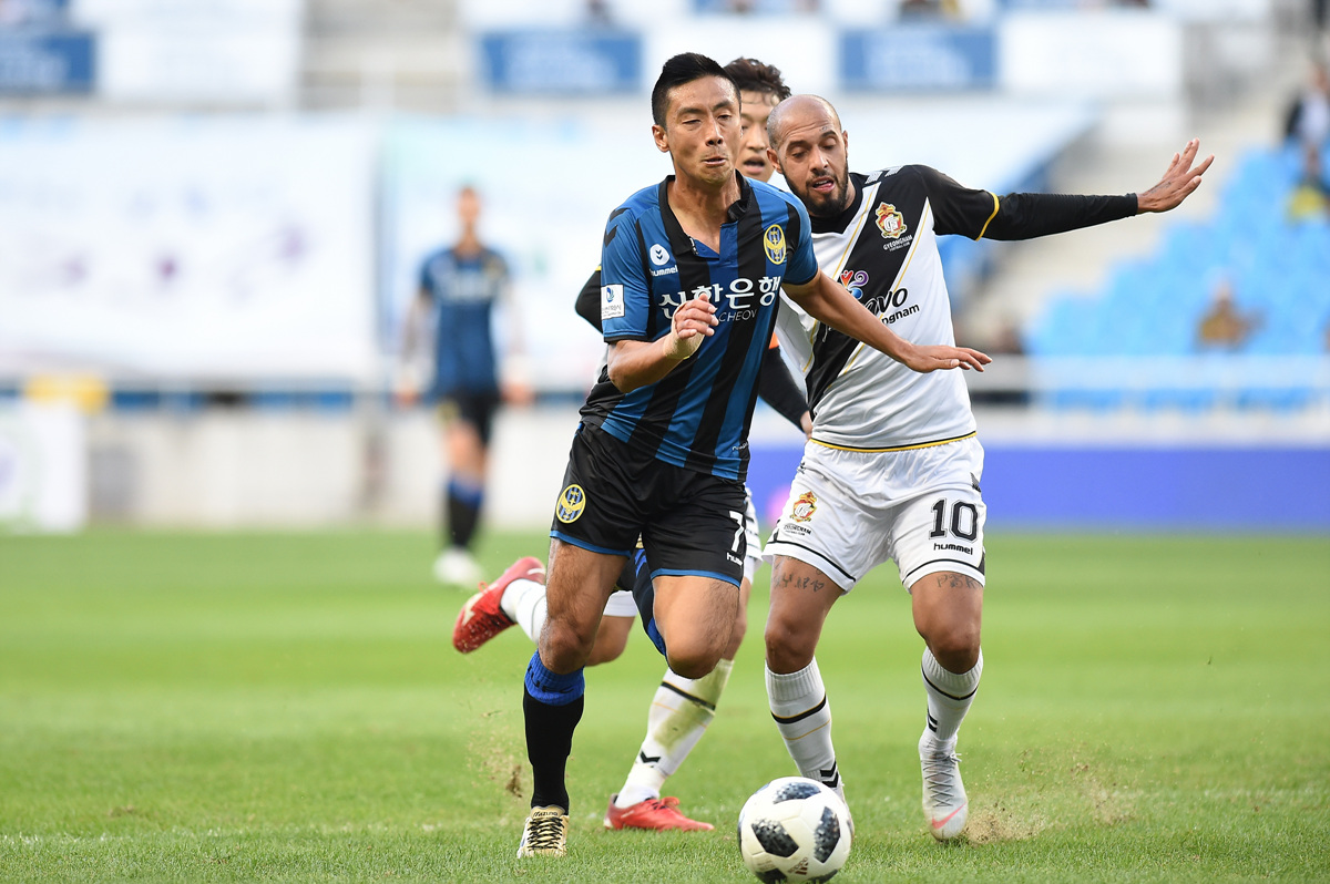 전반 초반 흐름은 홈팀 인천이 쥐었다. 비장한 각오로 차근히 경기 템포를 끌어 올렸다. 전반 17분 아길라르와 한석종이 연속 슈팅을 시도했지만 무위에 그쳤다. 전반 24분 인천이 위기를 넘겼다. 정산의 실수를 틈타 말컹이 슈팅을 날렸지만 바로 다시 정산이 몸을 던져 막아냈다.