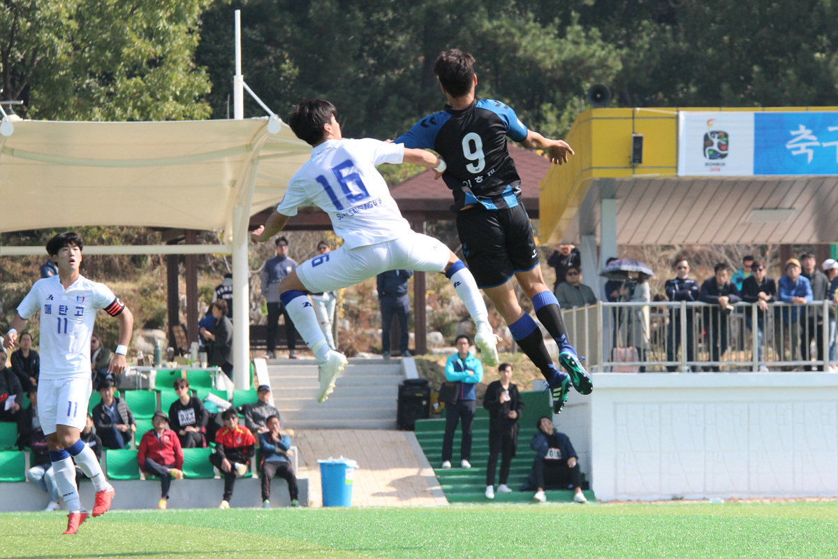 전반 초반부터 수원 매탄고의 강한 압박이 펼쳐졌다. 전반 3분 만에 인천 대건고가 선제골을 내줬다. 수비 뒷 공간을 허용하며 오현규에게 실점을 내준 것. 이후 반격에 나선 인천 대건고는 전반 12분 곧바로 동점골을 뽑아냈다. 최세윤의 긴 던지기를 이호재가 헤더로 마무리했다.