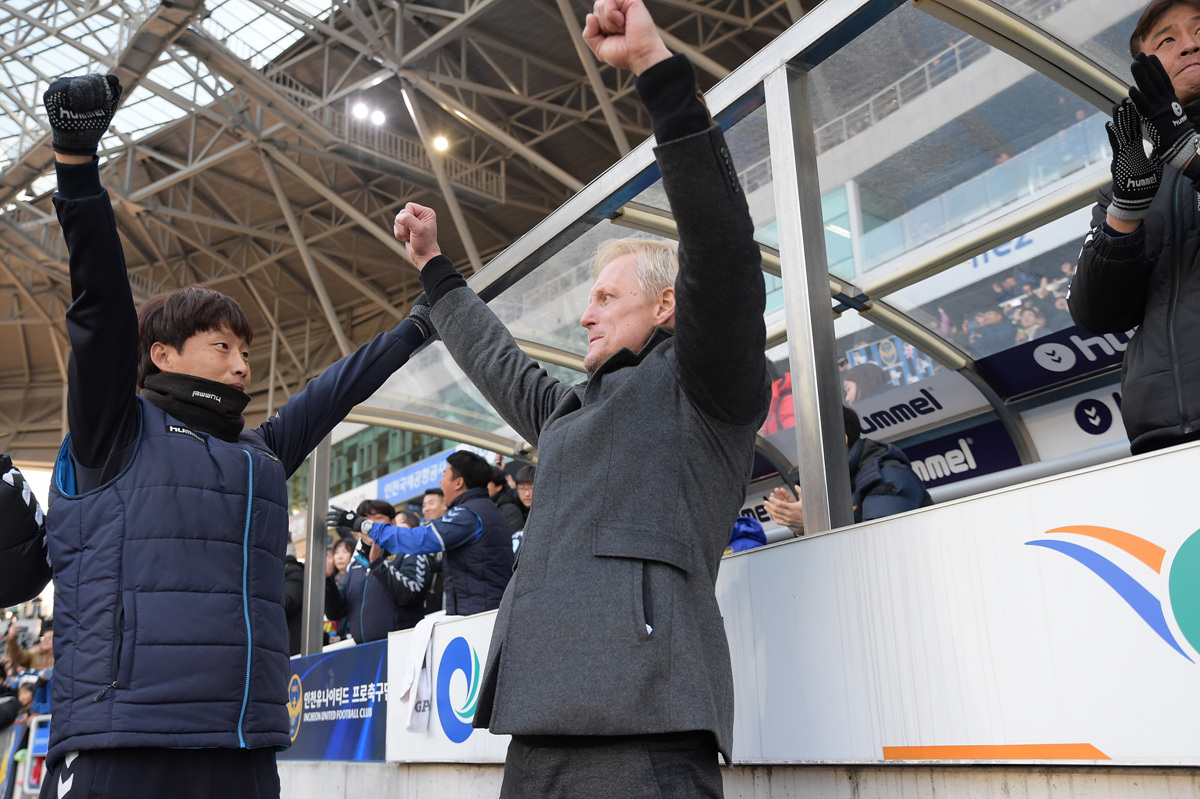 경기 후 공식 인터뷰에서 안데르센 인천 감독은 “우리 팀이 잔류한 사실에 기쁘다. 열심히 뛰어준 선수들에게 축하하고 싶다”고 운을 뗀 뒤 “오늘 경기는 쉽지 않았다. 비겨도 잔류할 수 있었지만 반드시 이기고 싶었다. 전술적으로 100%를 보여주는데 초반에 힘들었다”고 밝혔다.