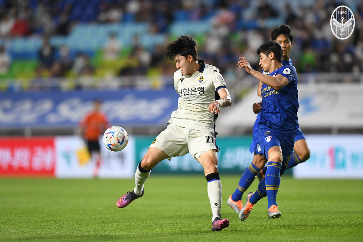전반 시작과 함께 인천은 볼을 소유하며 경기를 주도했다. 전반 1분 김성민이 박스 안에서 슈팅을 시도하며 초반 분위기를 가져왔다. 하지만 수원도 물러서지 않았다. 전반 3분 이기제가 왼쪽 측면에서 올려준 크로스를 김건희가 헤더로 마무리했지만 골문을 살짝 빗나갔다.