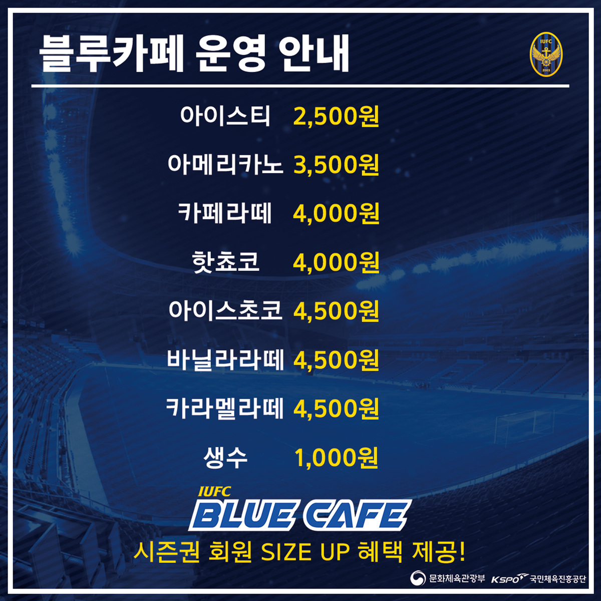 올해도 우리 인천유나이티드는 더로스터리뮤즈와 함께 블루카페를 운영하고 있습니다. 홈경기 당일 오픈하는 블루카페는 저렴한 가격에 맛있는 커피 및 음료를 즐길 수 있는 공간입니다.