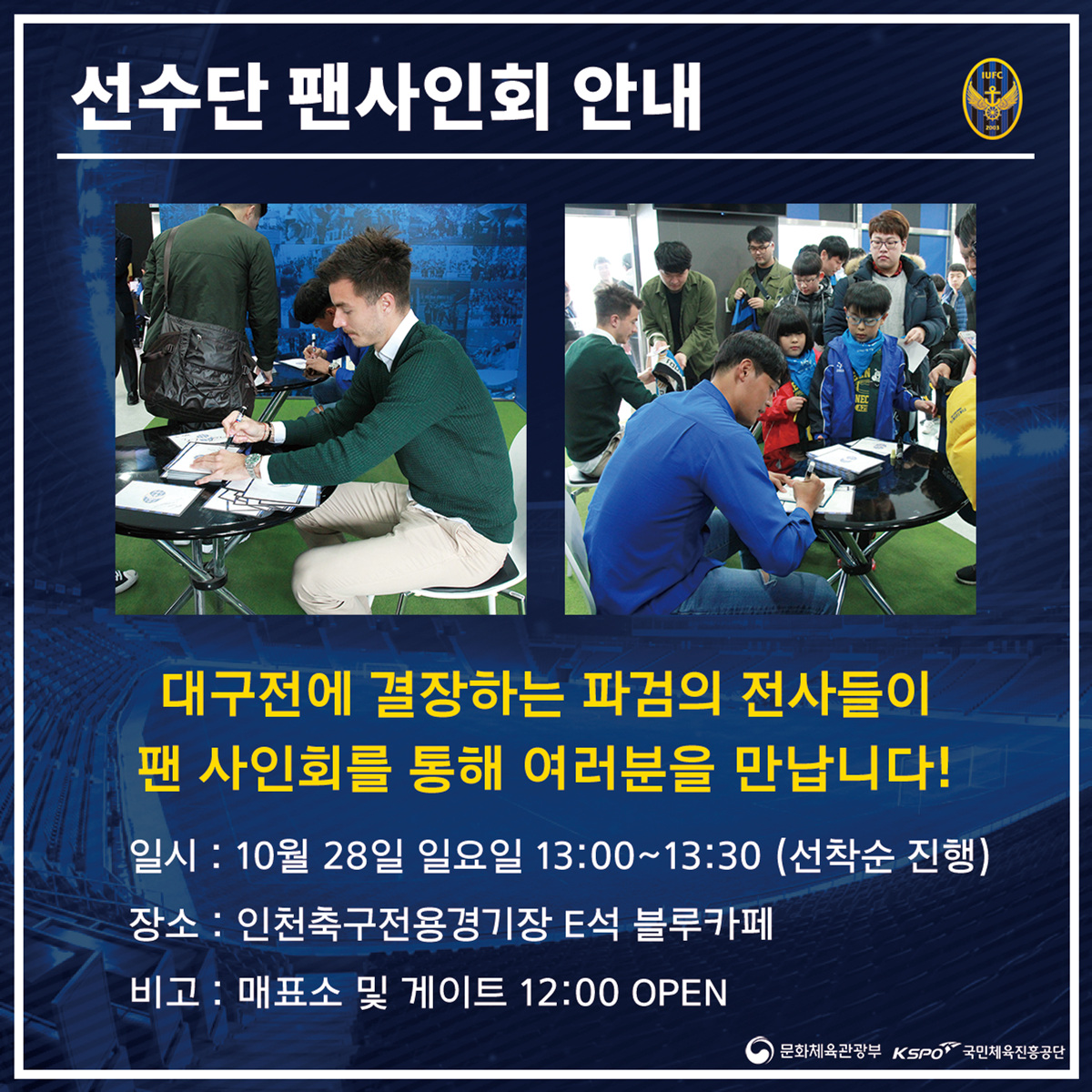 올해도 홈경기마다 선수단 팬 사인회 행사가 이어집니다. 이번 홈경기 팬 사인회는 오후 1시부터 1시 30분까지 E석 블루카페에서 선착순으로 진행됩니다. 사인회 참가 선수는 경기 시작 90분 전에 구단 SNS를 통해 공개됩니다. 인천 팬 여러분의 많은 관심을 부탁드리겠습니다.