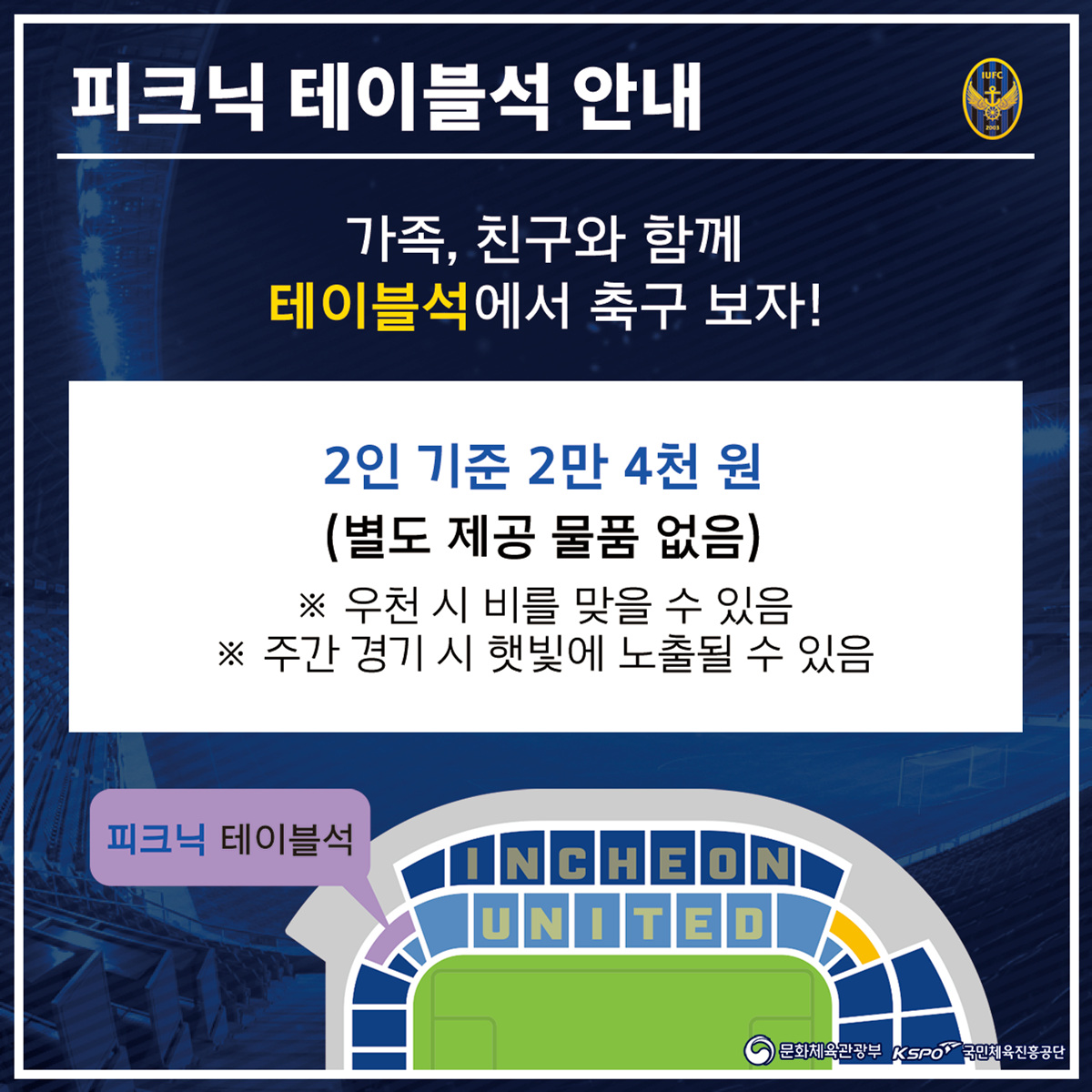 올 시즌 우리 인천유나이티드는 E석 전광판 아래의 테이블석을 활용해 ‘피드닉 테이블석’이라는 명칭과 함께 새로운 테이블석을 함께 운영하고 있습니다. 피크닉 테이블석은 2인 기준 2만 4천원에 판매되며, 앞서 소개한 하이트필바든존과는 달리 별도로 제공되는 물품은 없습니다.