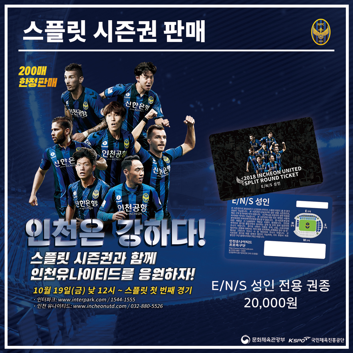 “2경기 가격에 스플릿 홈경기 모두 보자” 인천유나이티드가 스플릿 라운드 전용 시즌권을 출시했습니다. 시즌권 판매 권종은 E/N/S구역 성인권종이며 20,000원에 구매하실 수 있습니다.