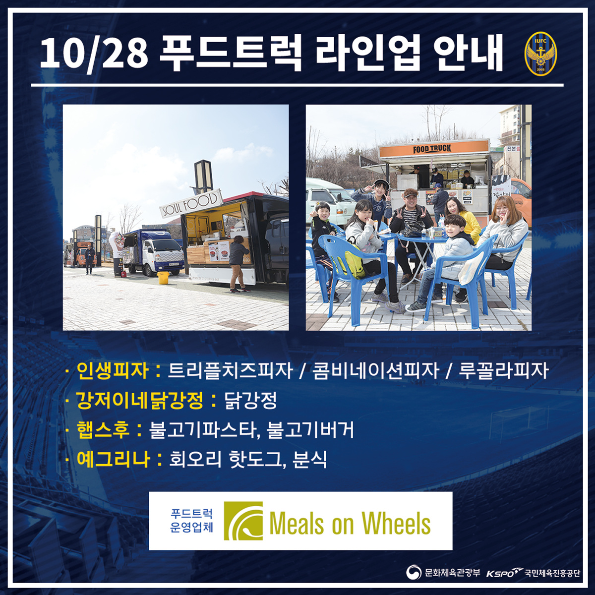 인천유나이티드 팬들의 입을 즐겁게 해주는 푸드트럭! 2018시즌에는 ‘밀스온휠스’와 함께 힘찬 출항에 나섰습니다. 이번 경기에 준비되는 푸드트럭의 메뉴 및 가격은 아래를 참고해주세요!