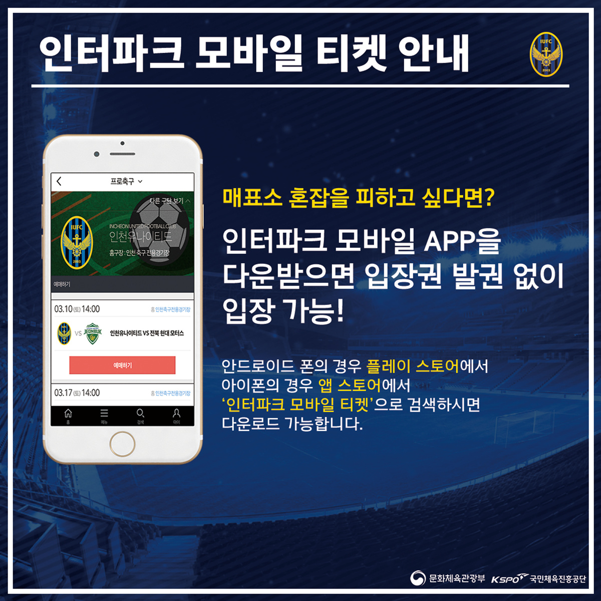 홈경기 당일 매표소 혼잡을 피하고 싶으신 분 주목! 인터파크 모바일 티켓에 대해 아시나요? 인터파크 모바일 티켓 APP을 다운받으면 입장권 발권 없이 바로 게이트 입장이 가능합니다.