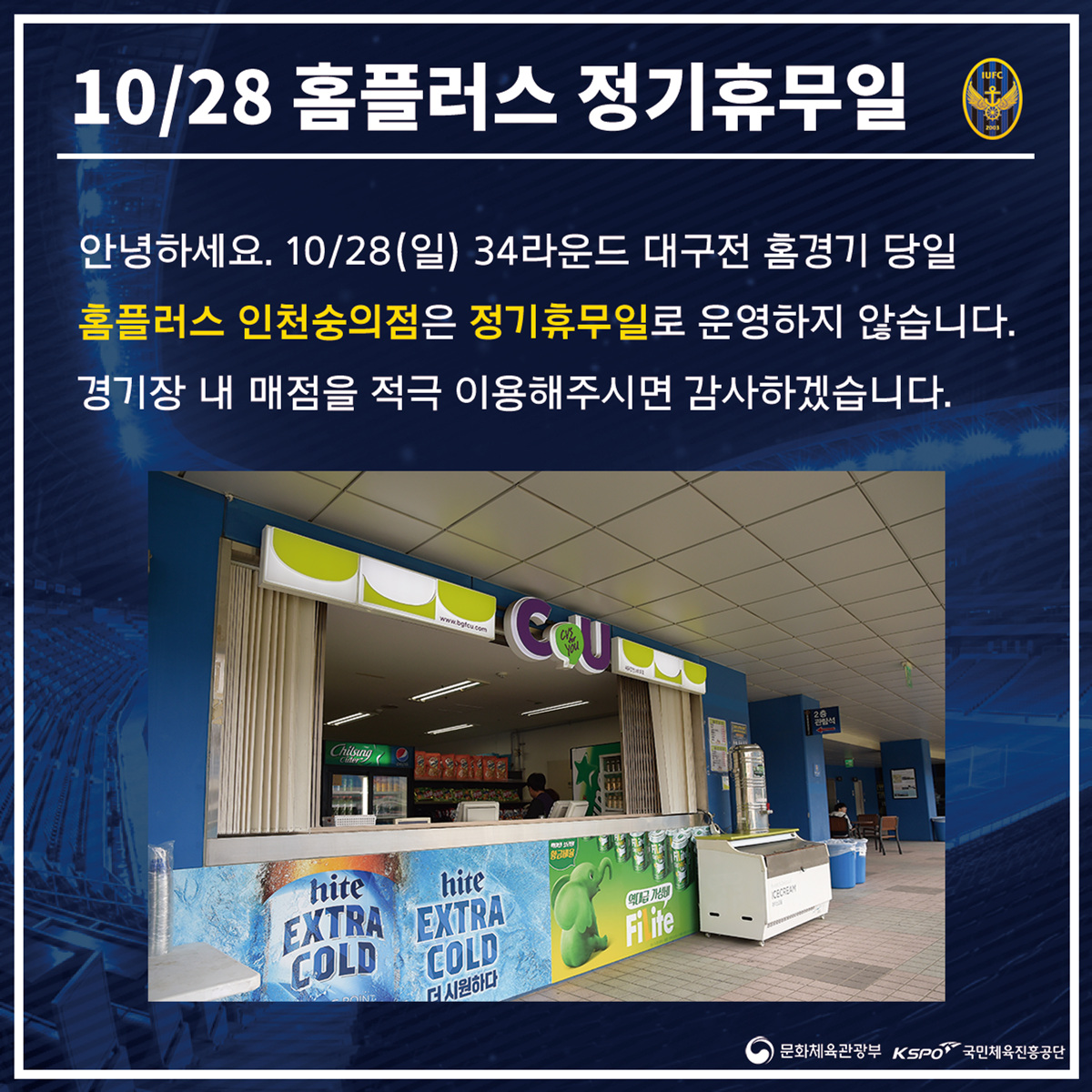 10월 28일. 대구전 홈경기 당일 홈플러스 인천 숭의점은 정기 휴무일로 운영하지 않습니다. 인천 팬 여러분께서는 경기장 내 매점을 적극 이용해주시길 부탁드리겠습니다. 감사합니다.