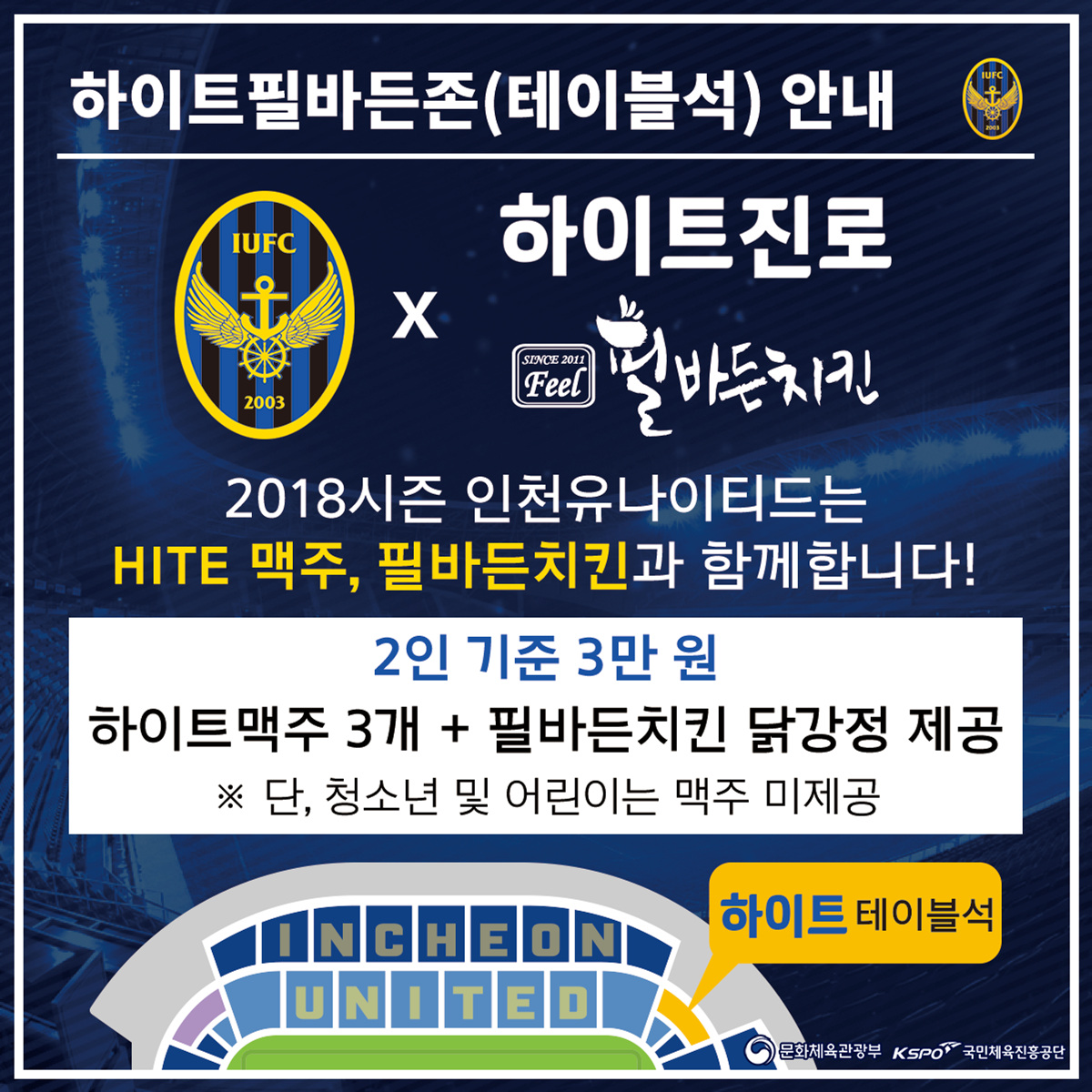 올 시즌 우리 인천유나이티드는 하이트맥주-필바든치킨과 함께합니다. 이에 따라 기존 볼메존으로 운영되었던 E석-S석 사이 코너에 위치한 테이블석이 ‘하이트필바든존’으로 운영됩니다.