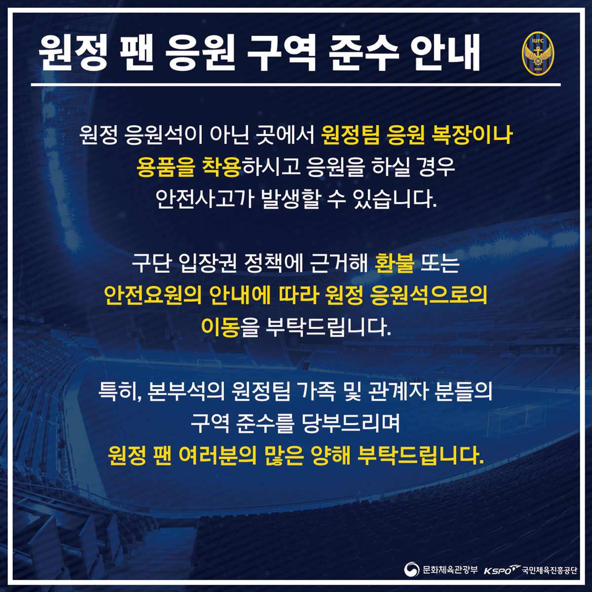 이에 원정 팬 여러분께서는 원정석을 이용해주시길 정중히 부탁드립니다. 만약 원정팬이 원정석 이외의 구역에서 관람하실 경우에는 우리 구단 입장권 정책에 근거해 환불 또는 안전요원의 안내에 따라 원정석으로의 좌석 이동 조치가 이루어질 수 있음을 유념해주시기 바랍니다.