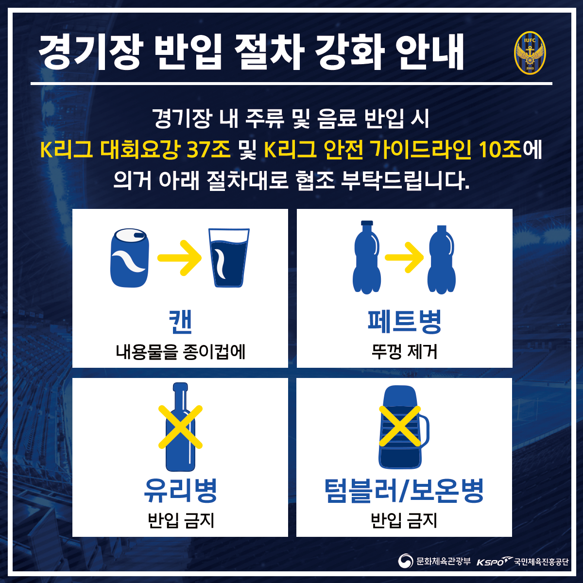 K리그 대회요강 37조 및 안전가이드 라인 10조와 13조에 의거하여 우리 구단은 홈경기 당일 경기장 물품 반입 절차 및 매점 판매 물품에 대한 관리 감독을 철저하게 진행하고 있습니다.