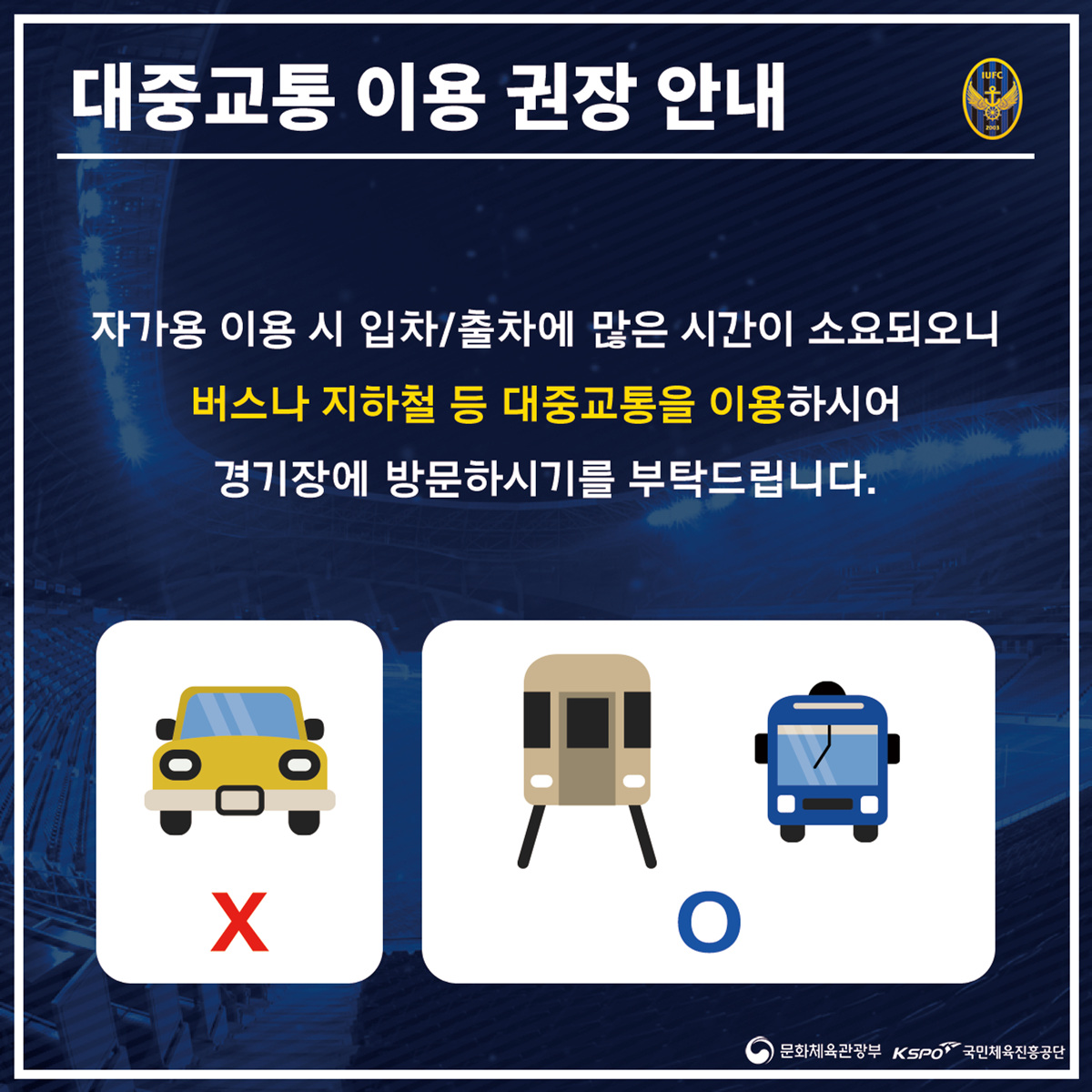 대중교통을 이용한 홈경기 방문을 권장합니다! 우리 인천유나이티드의 홈구장 인천축구전용경기장은 국철 도원역, 수인선 숭의역에서 각각 하차하시면 됩니다. 교통체증 방지 그리고 환경오염 방지를 위해 팬 여러분의 대중교통 이용을 다시 한 번 부탁드리겠습니다. 감사합니다.