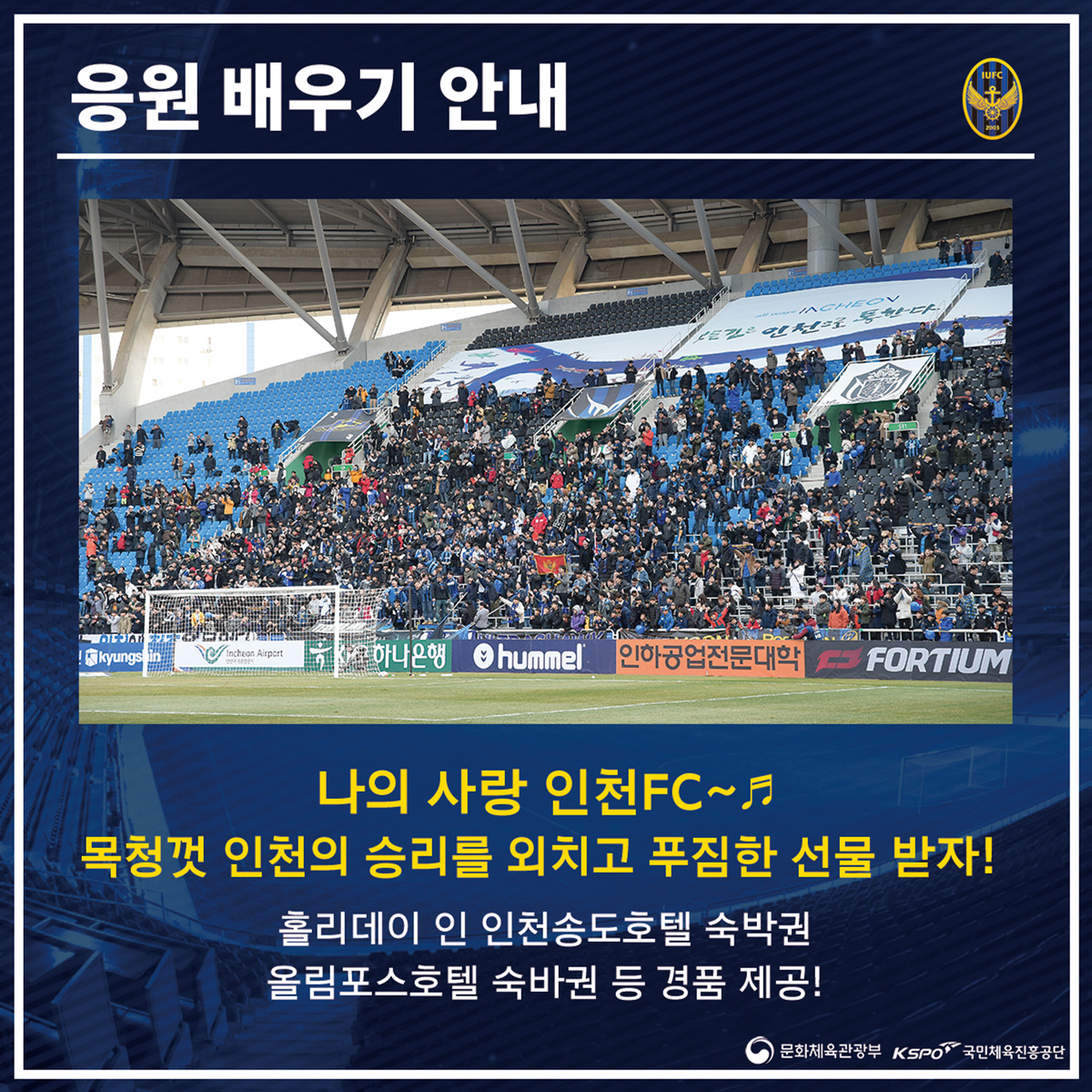 목청껏 인천을 외치고, 푸짐한 경품도 팡! 팡! 올 시즌에도 경기 전 응원배우기 이벤트는 계속 이어집니다. 현장에서 큰 목소리로 함께 호응해주신 분들께 홀리데이 인 인천 송도호텔 숙박권, 올림포스호텔 숙박권 등 다양한 경품을 제공합니다!!! 다함께 인천을 소리질러~~!!! ♬♬♬