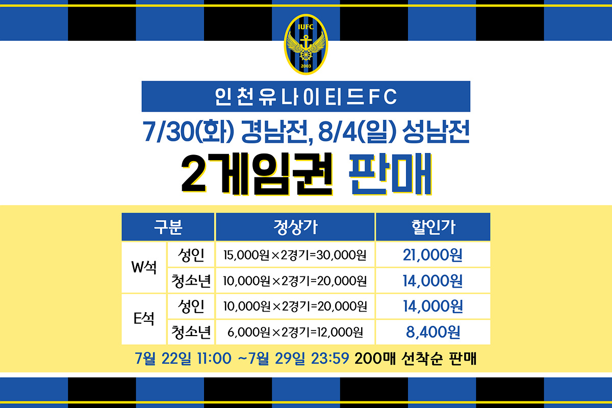 이번 2게임권은 지난 7월 초 홈 2연전 ‘ㅅㅇ전 2게임권’의 후속판으로 7월 30일 화요일 오후 7시 30분 인천축구전용경기장에서 펼쳐지는 ‘하나원큐 K리그 1 2019’ 23라운드 경남FC전과 8월 4일 일요일 오후 8시에 열리는 24라운드 성남FC전을 할인된 가격에 모두 관람할 수 있는 입장권이다.