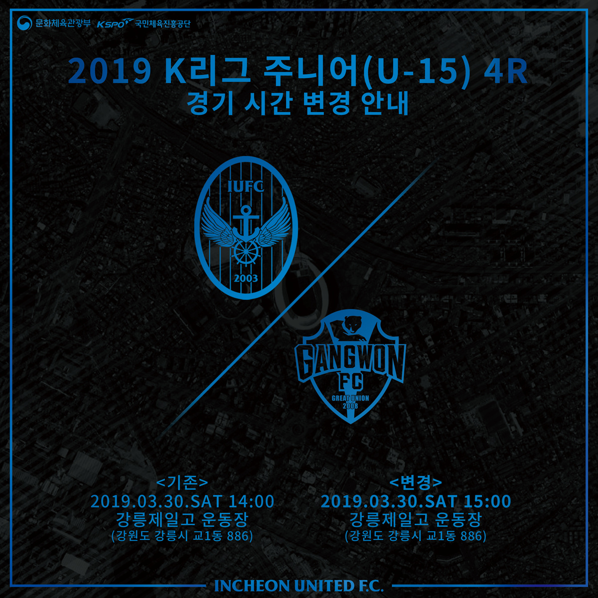 안녕하세요, 인천유나이티드입니다. ‘2019 아디다스 K리그 주니어(U-15)’ 4라운드 인천 광성중과 강원 주문진중의 경기 시간이 변경되었습니다.
