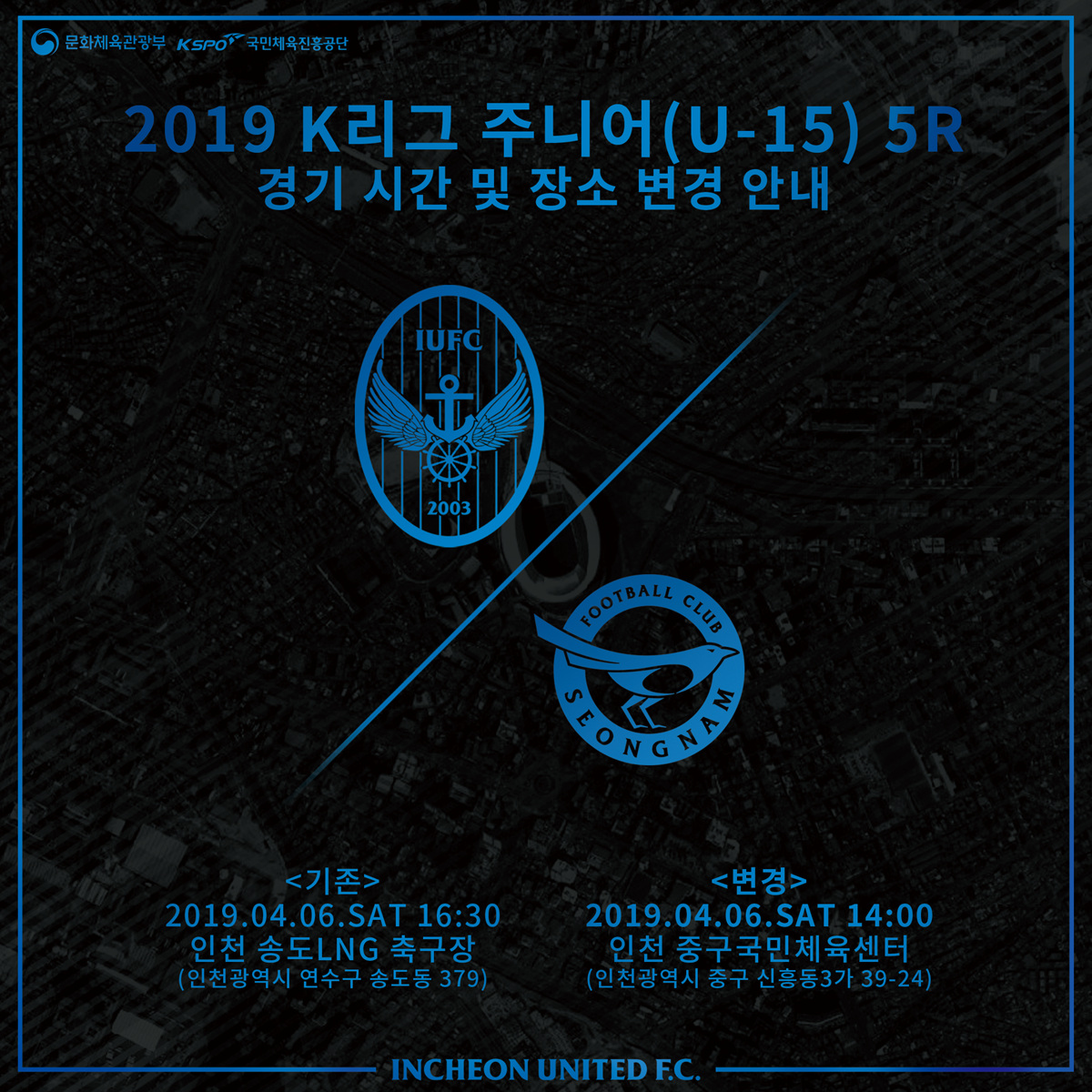 안녕하세요, 인천유나이티드입니다. ‘2019 아디다스 K리그 주니어(U-15)’ 5라운드 인천 광성중과 성남FC U-15의 경기 시간 및 장소가 변경되었습니다.