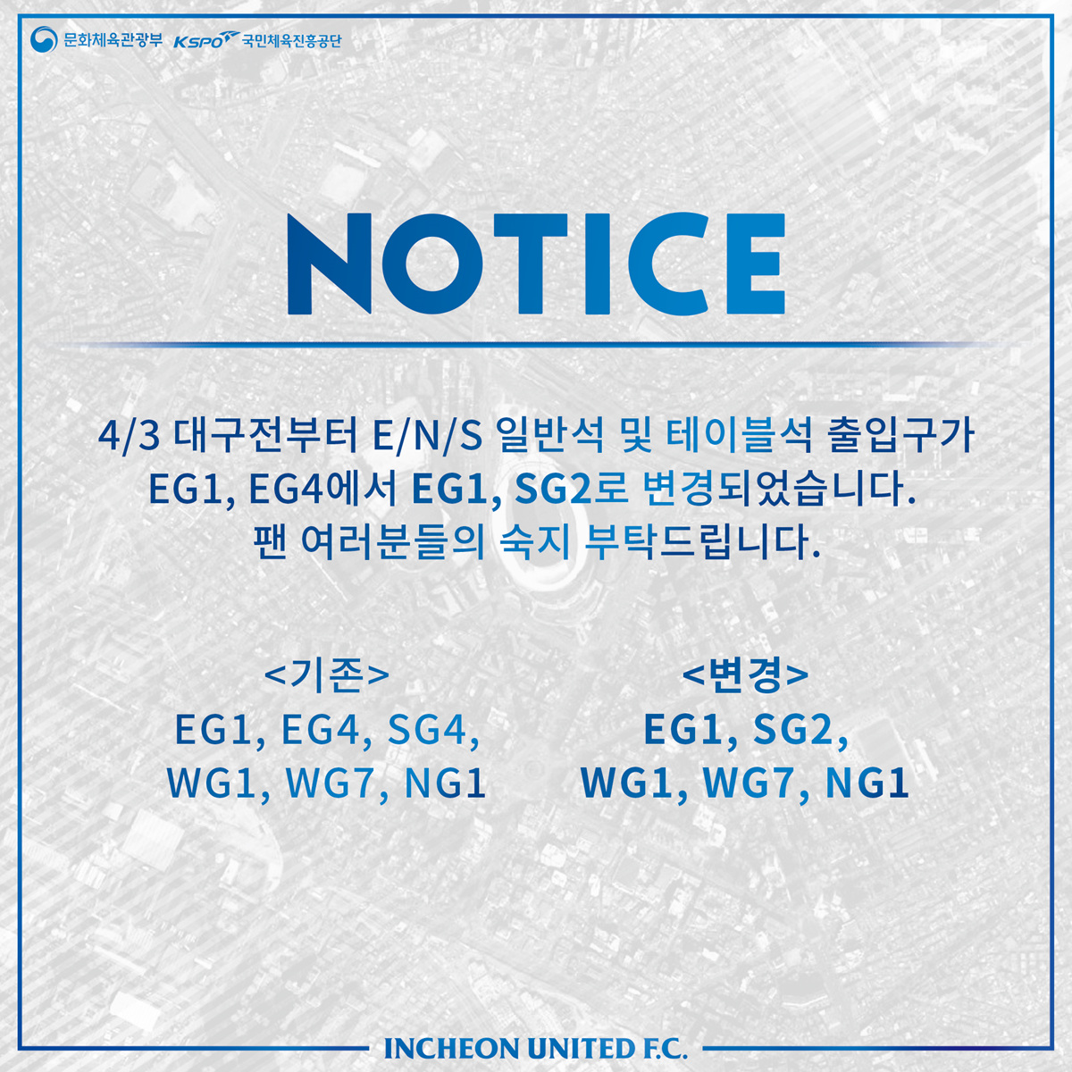 안녕하세요, 인천유나이티드입니다. 보다 효율적인 홈경기 게이트 운영을 위해 4/3 대구전 홈경기부터 인천축구전용경기장 ENS일반석 및 테이블석 출입구가 일부 변경되어 공지 말씀을 전합니다.