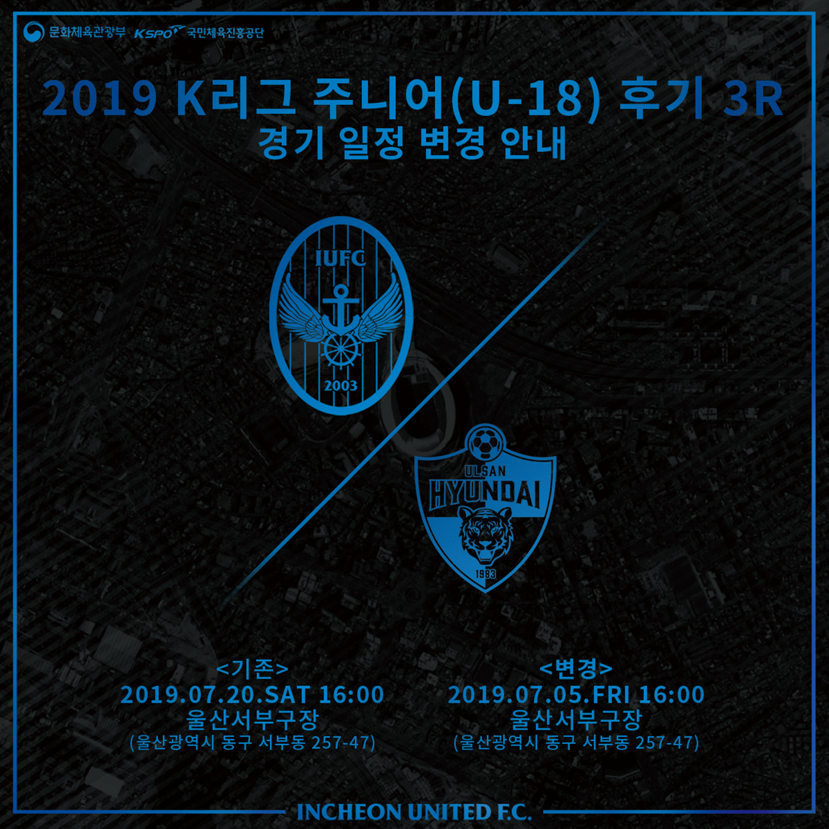 안녕하세요, 인천유나이티드입니다. ‘2019 아디다스 K리그 주니어(U-18)’ 후기리그 3라운드 인천 대건고와 울산 현대고의 경기 일정이 변경되었습니다.