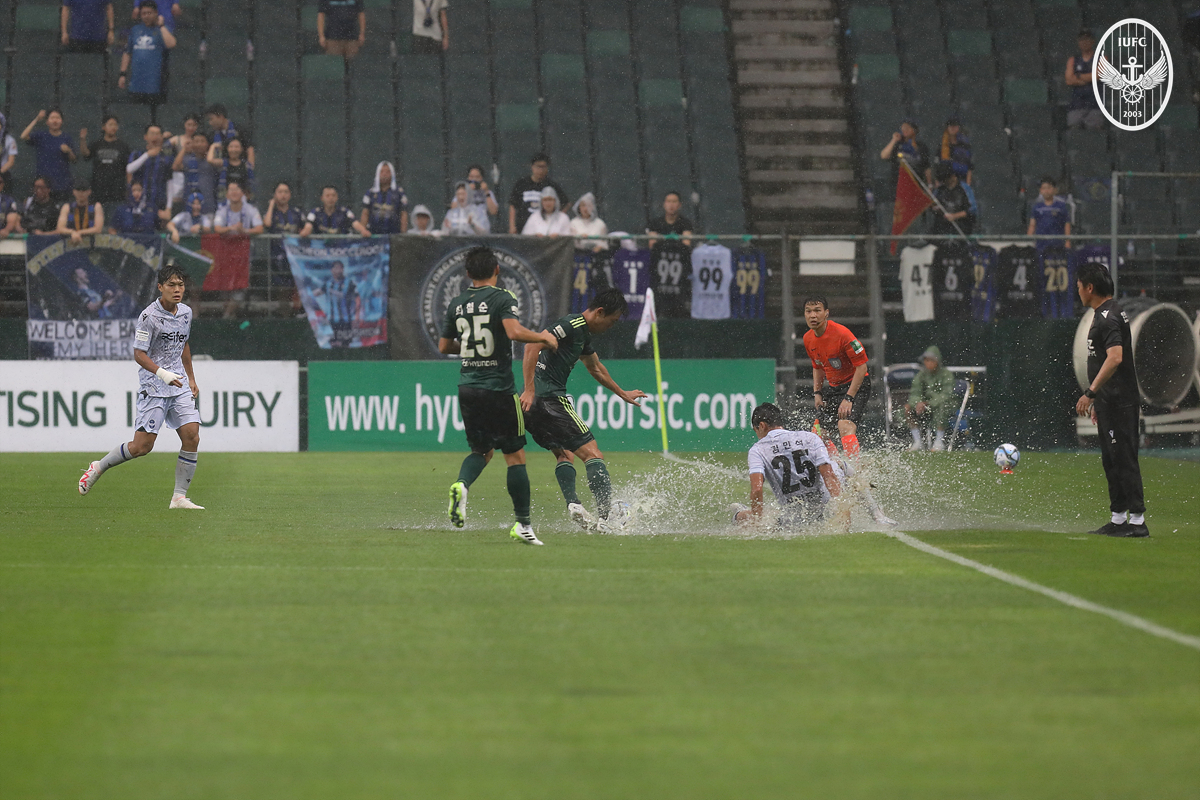 전반전 변수는 비였다. 킥오프 직전부터 경기장에 내린 폭우로 그라운드가 완전히 물에 잠겼다. 곳곳에 물웅덩이가 고여 있어 공이 제대로 구르지 않았다. 선수들이 공의 움직임을 예상하기 어려웠다. 평소와 다른 환경에 어수선하게 경기가 전개되었다.