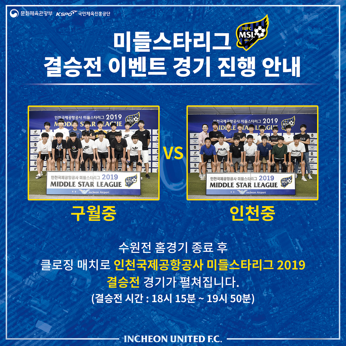 수원전 홈경기 종료 후 ‘인천국제공항공사 미들스타리그 2019’ 결승전이 클로징 매치로 진행됩니다. 지난 2017년에 이어 두 번째로 결승전 맞대결을 펼치는 구월중과 인천중의 리벤지 매치! 경기 후 자리를 떠나지 마시고 중학생들의 박친감 넘치는 결승전 경기를 맛보세요. 인천 팬 여러분의 많은 관심과 관람을 부탁드립니다.