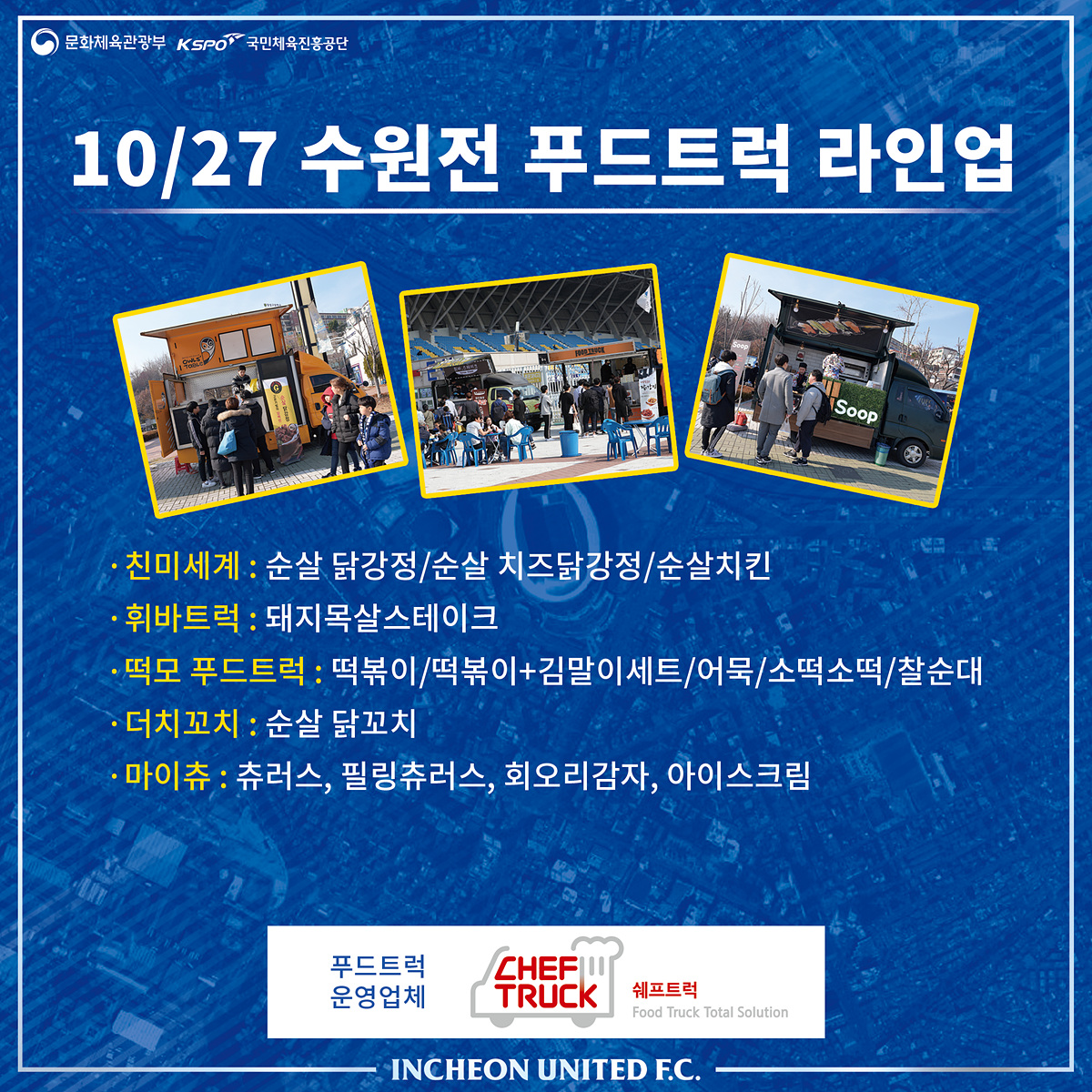 인천유나이티드 팬들의 입을 즐겁게 해주는 푸드트럭! 2019시즌에는 ‘쉐프트럭’과 함께하고 있습니다. 이번 수원전 홈경기에 찾아오는 푸드트럭의 메뉴 및 가격은 아래를 참고해주세요!