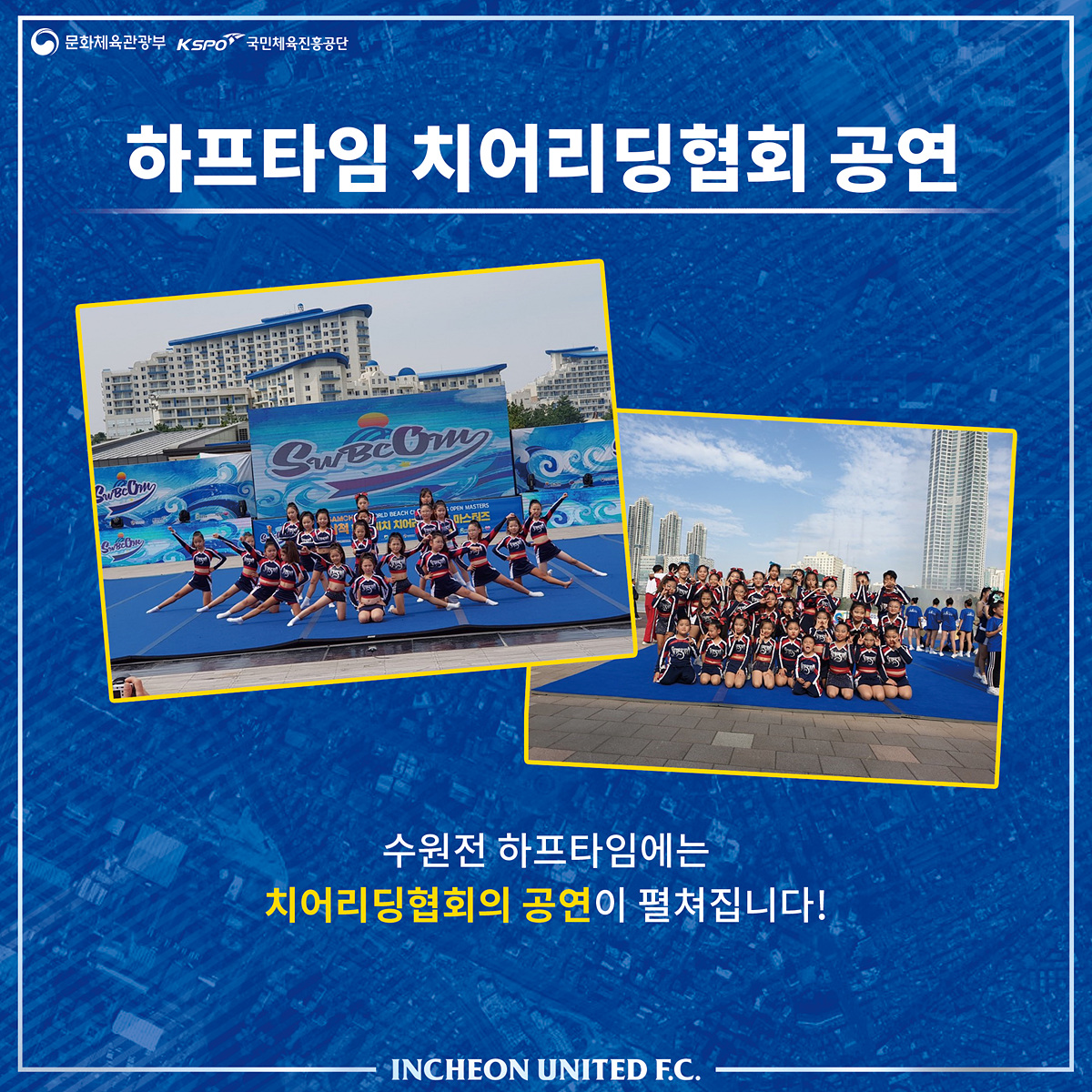 이번 수원전 홈경기 하프타임에는 치어리딩협회가 인천의 승리를 기원하며 치어리딩 축하 공연에 나섭니다. 힘찬 박수로 공연을 맞이해주시면 감사하겠습니다.