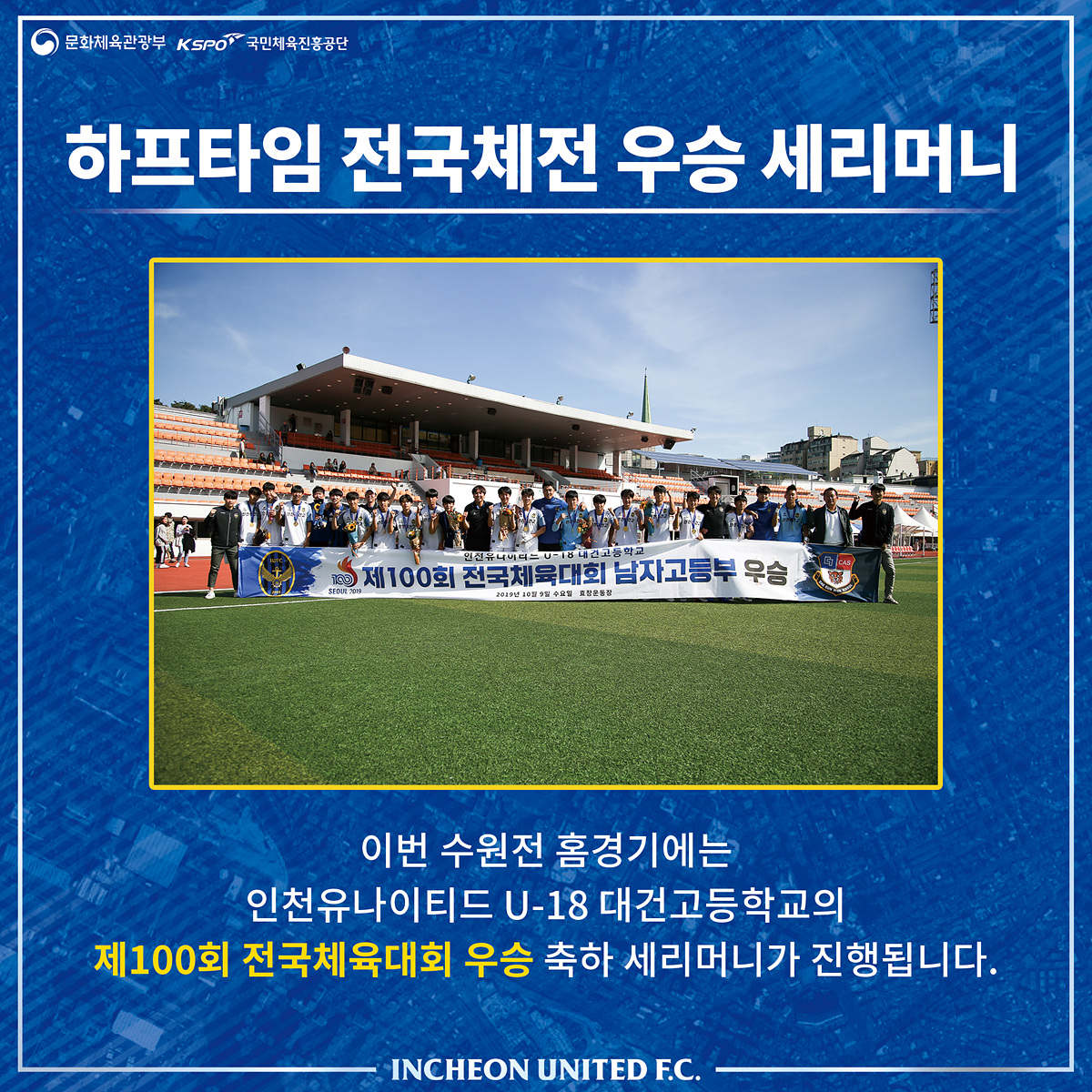 이날 하프타임에는 인천유나이티드 U-18 대건고 선수들의 제100회 전국체육대회 우승 세리머니가 있을 예정입니다. 사상 첫 전국체전 금메달을 목에 건 자랑스러운 미래 파검의 전사들에게 아낌없는 격려와 축하의 박수를 부탁드립니다!