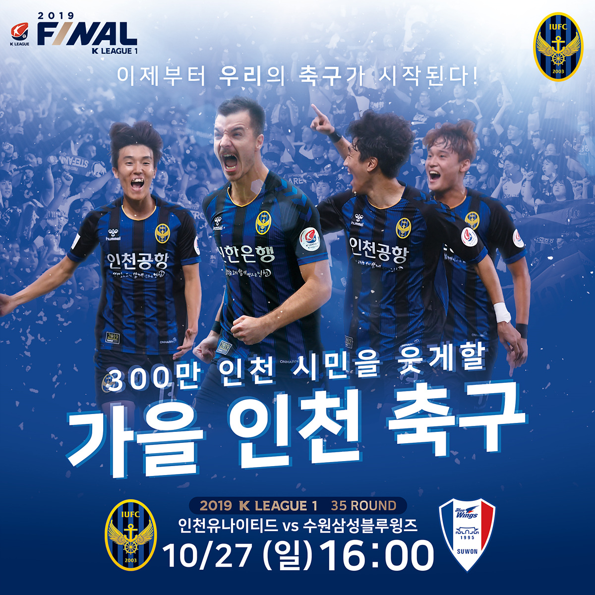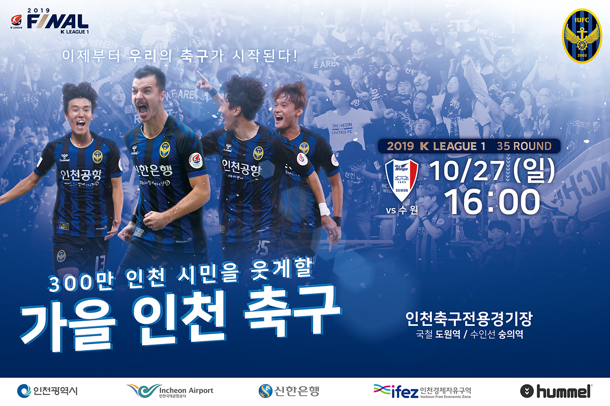 “이번 수원전에서 인천 시민을 웃게 할 ‘가을 인천 축구’가 시작됩니다”10/27(일) 오후 4시. 우리 인천유나이티드가 수원삼성을 상대로 파이널 라운드 첫 홈경기, 올 시즌 18번째 홈경기를 치릅니다. 지난 2013년 이후 6년 동안 갖고 있었던 수원전 홈경기 무승 징크스를 깰 수 있는 절호의 기회! 인천 구성원 모두가 한마음이 된 지금, 수원전 승리를 통해 인천축구전용경기장에서 승리의 만세삼창을 외치고 강등권과의 격차를 벌릴 수 있도록 인천 팬 여러분의 많은 응원과 격려를 부탁드립니다.