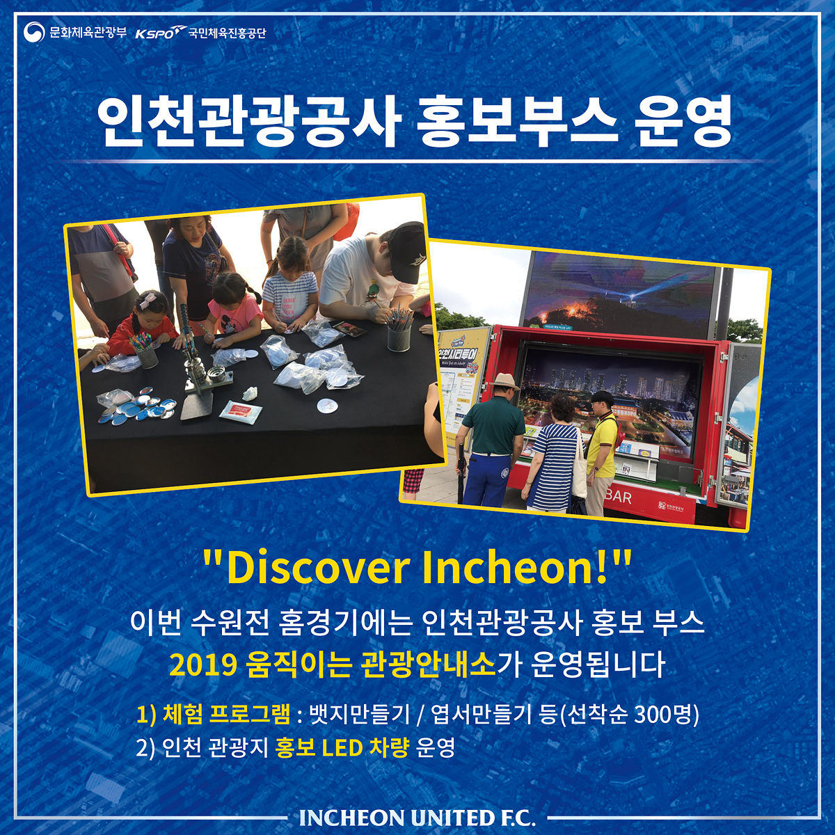 이번 수원전 홈경기에는 인천관광공사 홍보 부스인 ‘2019 움직이는 관광안내소’가 운영됩니다. LED 차량을 이용한 인천 관광지 홍보와 팬들을 위한 뱃지 만들기, 엽서 만들기 등 체험의 장이 마련될 예정이오니 인천 시민 여러분의 많은 참여 바랍니다.