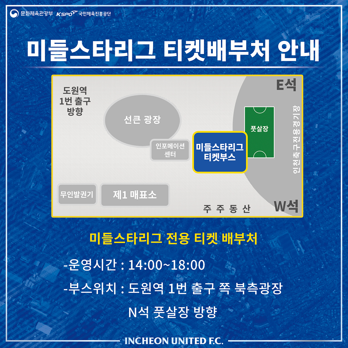 이번 수원전 홈경기 북측 광장에서는 인천관광공사 홍보 부스와 미들스타리그 전용 티켓 부스를 비롯해 푸드트럭 5개소가 운영됩니다. 또한, 선큰광장 방향에선 인포메이션 센터 부스가 운영되어 각종 문의 사항에 답변해 드릴 예정이오니 인천 팬 여러분의 많은 관심과 참여를 부탁드립니다.