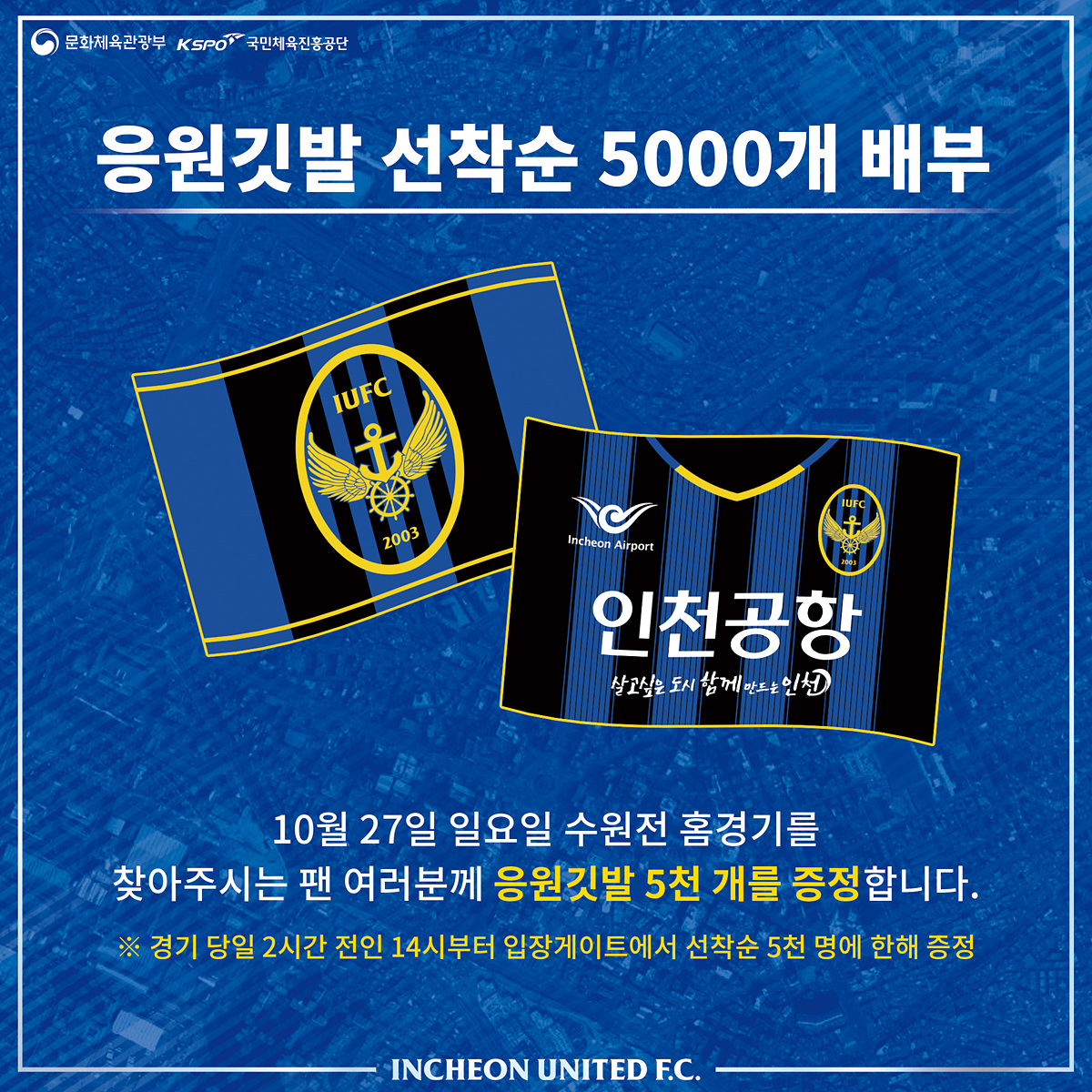 “다 함께 인천유나이티드 응원 깃발을 흔들어주세요!” 이번 홈경기 입장게이트에서는 인천의 홈경기 승리를 기원하는 응원 깃발을 배부할 예정입니다. 선착순 5,000개가 모두 소진될 경우 배부받지 못할 수 있으니 이점 양해 바랍니다.