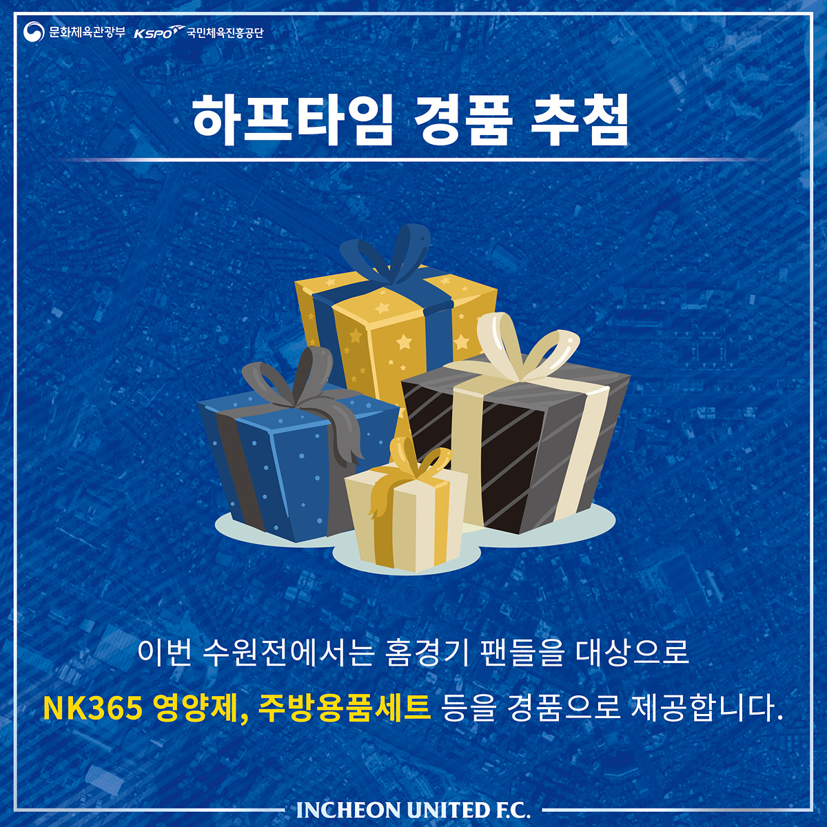 “행운의 주인공이 되어 보세요!” 수원전 홈경기 관람객을 대상으로 한 특별 이벤트! 추첨을 통해 NK365(영양제), 주방용품세트 등 경품을 제공합니다. 인천 팬 여러분의 많은 관심과 참여 부탁드립니다.