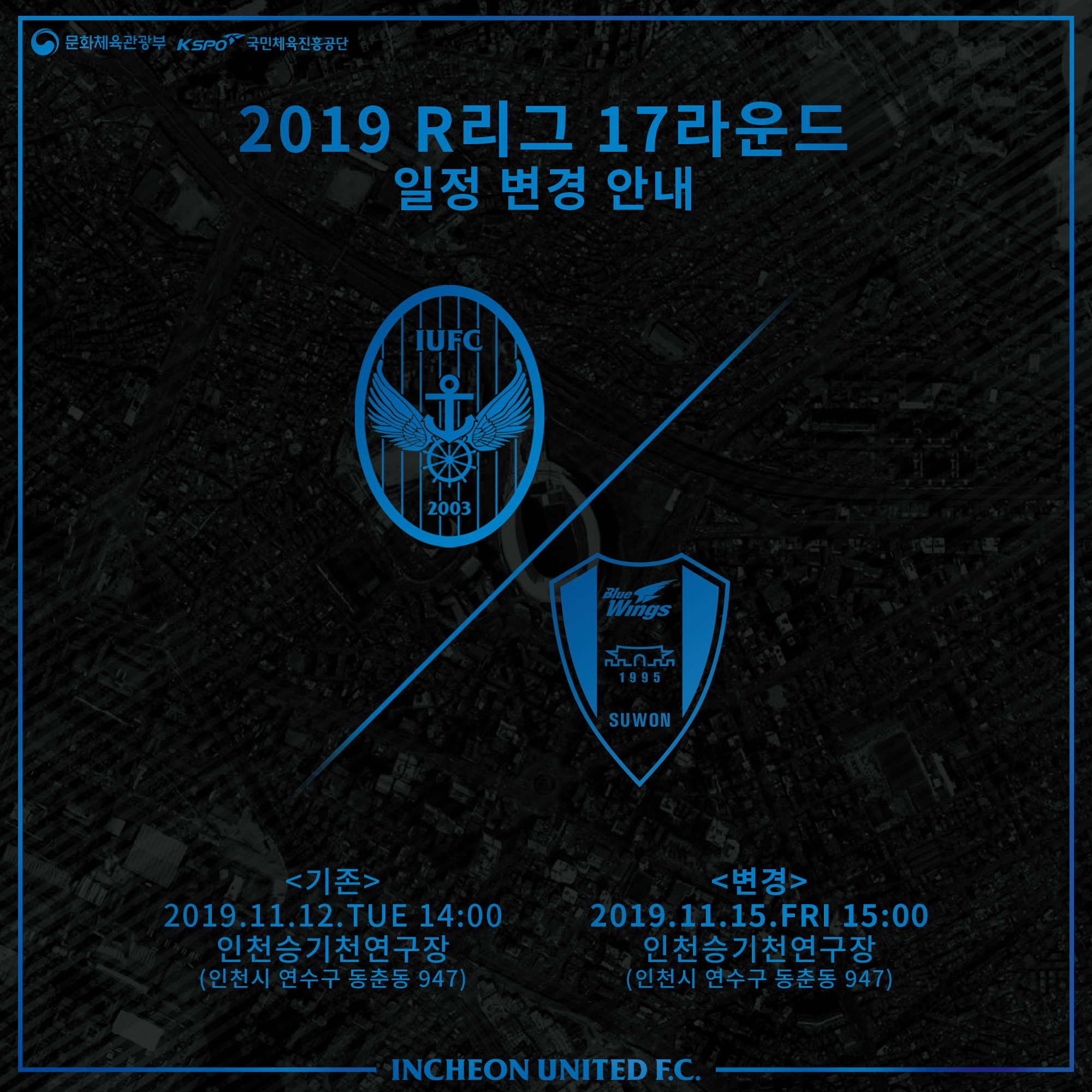 안녕하세요, 인천유나이티드입니다. R리그 17라운드 홈경기 일정이 변경되어 팬 여러분께 안내 말씀을 드립니다.